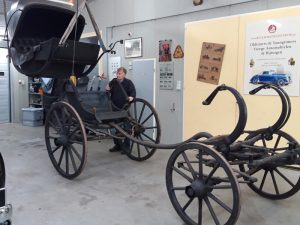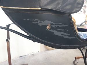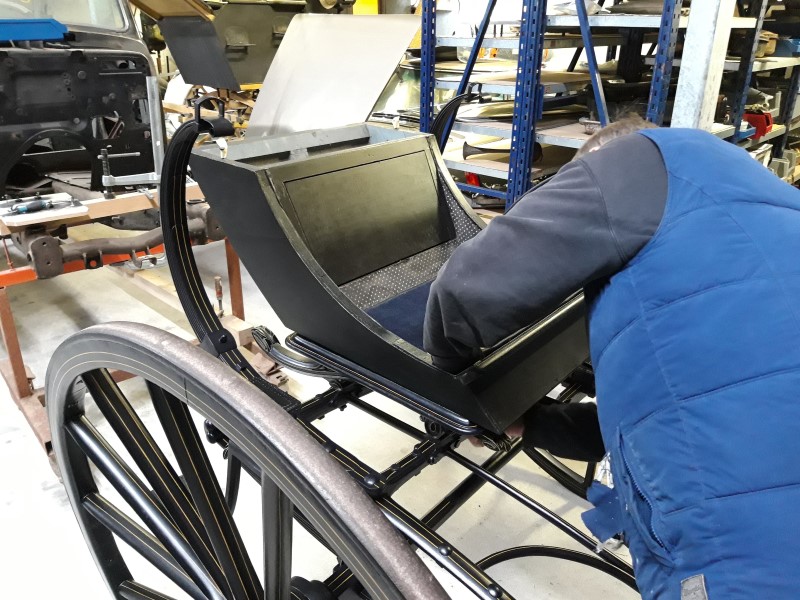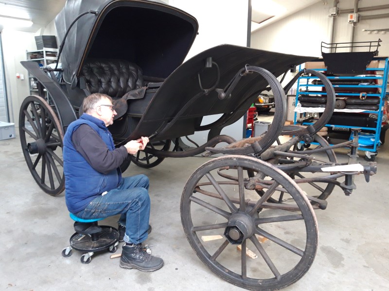 De eerste stapjes bij de restauratie van de Calèche: de bak hangt nu letterlijk en figuurlijk in de riemen. ‘In de riemen’ is een vakterm voor rijtuig als dit, dat extra luxe is geveerd met ellipsveren en c-veren.