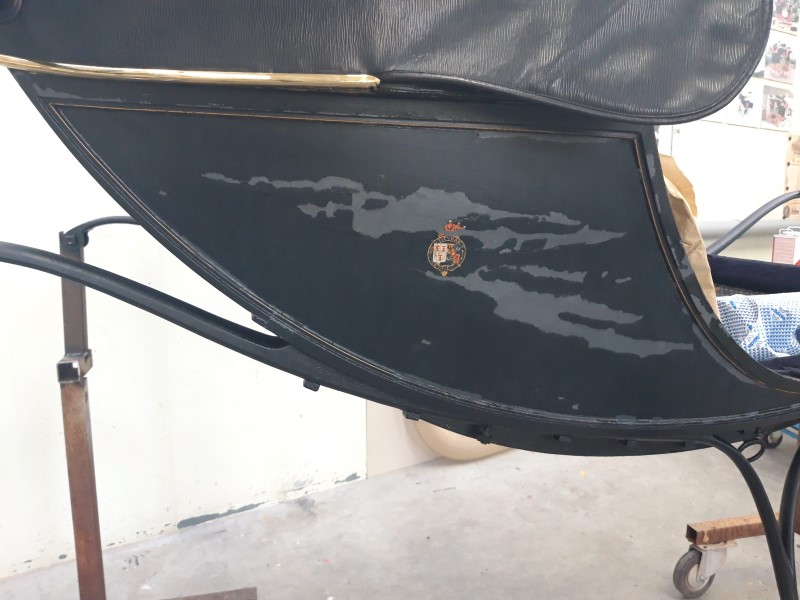 Van alle rijtuigen in het depot van het Nationaal Rijtuigmuseum in Leek was de Grand Duc eigenlijk een soort kanarie in de mijngang. Bij dit rijtuig was jaren geleden als eerste zichtbaar dat er iets aan het klimaat in het depot moest gebeuren, want de verf aan zijpanelen bladderden er af. Daarmee kwamen ook de prachtige wapentjes die er op waren geschilderd in gevaar. Gelukkig is toen ingegrepen. De afgebladderde verf is tijdelijk vastgezet om verder verval te voorkomen en het klimaat is verbeterd. We zijn nu een half jaar op weg en de restauratie van de Grand Duc loopt op zijn einde. Het onderstel is weer in elkaar gezet, het bokkussen is met nieuw laken bekleed, om het oude linoleum op de vloer te beschermen zijn er uitneembare kleedjes gemaakt en de kaplijst blinkend gepolijst.