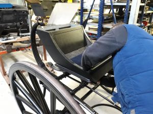 Piet Stolk werkt aan een uitneembaar tapijtje op de knechtenbank van de Grand Duc, terwijl het bokkussen van datzelfde rijtuig nieuwe lakense stof krijgt.