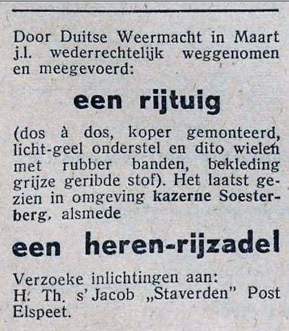 De oud-burgemeester overlijdt in 1934 op bijna 85-jarige leeftijd. Daarmee maakt hij niet meer mee dat in 1938 de tolheffing op de weg voor het kasteel verdwijnt: een jarenlang twistpunt. De oprijlaan maakt deel uit van de grindweg van de gemeente Ermelo en s’Jacob moest telkens tol betalen als hij uit de richting van Harderwijk kwam. Dus wat doet de man die alle grond rond het tolhuis bezit: hij legt een weg rond het tolhuis aan en laat iedereen er gratis gebruik van maken. Alleen argeloze toeristen liepen nog in de fuik en moesten tol betalen. Tot 1938 dus, wanneer Ermelo wijselijk de tol opheft. Even licht het leven op Staverden nog op als in 1940 de kleindochter van de oud-burgemeester trouwt met een Baron van Heemstra en koppen de kranten over het societyhuwelijk’; ze gaan te voet van de kapel naar het kasteel. Een rijtuig komt er niet aan te pas. En daarna gaat de glorietijd van de s’Jacobs op Staverden uit als een nachtkaars. In 1944 sterft koetsier Rijnsent als weduwnaar en ‘zonder beroep’ in Den Haag. Over wat er in de stallen gebeurde verschijnt in 1945 nog een laatste berichtje in de krant: “Door Duitse Weermacht in Maart jl. wederrechtelijk weggenomen en meegevoerd: een rijtuig (dos è dos, koper gemonteerd, lichtgeel onderstel en dito wielen met rubber banden, bekleding grijze geribde stof). Het laatst gezien in omgeving kazerne Soesterberg, alsmede een heren-rijzadel Verzoeke inlichtingen aan: H.Th. s’Jacob Staverden Post Elspeet.” Naar het schijnt zijn door de Duitse bezetters meer rijtuigen geconfisqueerd.