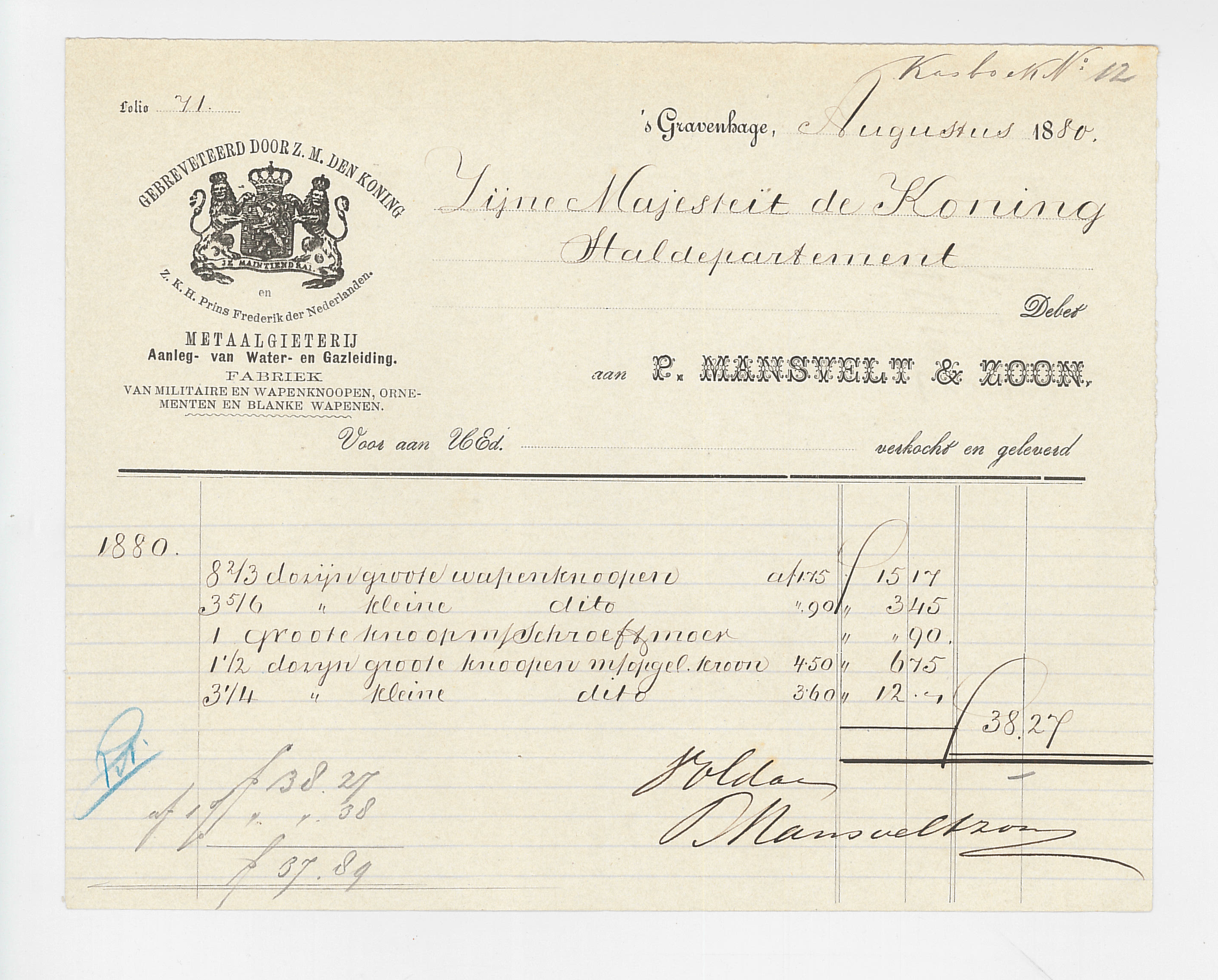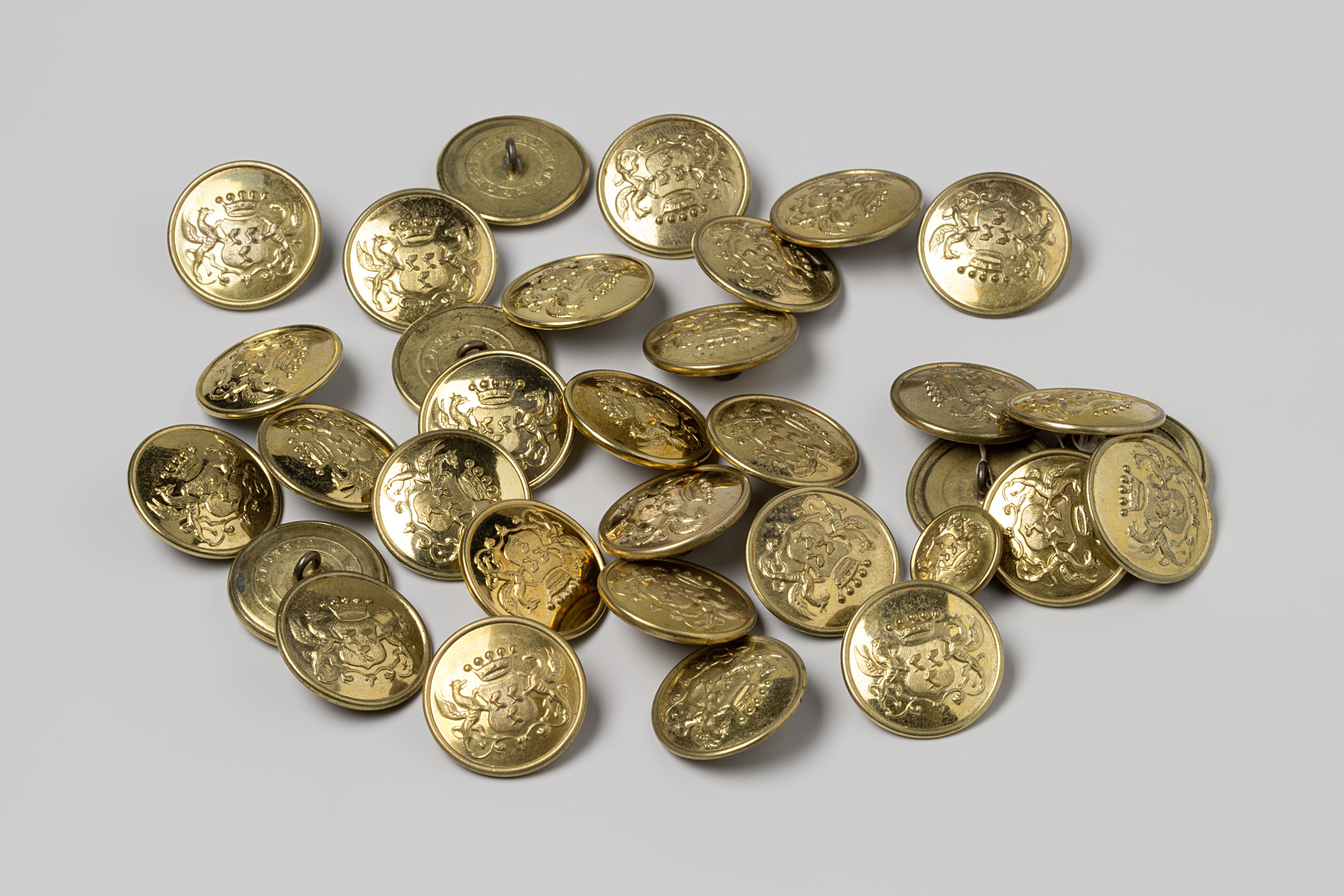 Eigenlijk is het alleen voor officiële gebeurtenissen van de koning dat er nog personeel rondloopt in het livrei met zulke knopen. Bij een staatsbanket of wanneer de Koninklijke Stallen uitrijden. Dat brengt ons bij het bijzondere ambacht van de livreiknopenmaker. Want hoe kwam je daar aan? Vrijwel alle oude knopen van de Koninklijke Stallen zijn aan de achterkant gemerkt met ‘P. Mansvelt & Zoon, ’s-Gravenhage’, een hofleverancier aan de Denneweg 10, om de hoek bij het staldepartement, en de straat waar iets verderop de koninklijke tuigenmaker Jonas-Bouman zat. Het Koninklijk Huisarchief heeft nog keurig een paar facturen bewaard en aan de hand daarvan weten we, dat de ‘rij- en koetsstal’ in 1879 alleen al 964 grote en 1.192 kleine wapenknopen bestelde, plus nog een doos vol met alleen een koningskroontje er op. Afhankelijk van het model, voor postiljon, groot gala of gala gaan er zo tien tot twintig knopen op een jas. Ga maar na: op de mouwomslagen, achterop, bij de kraag en natuurlijk op de borst in enkele of dubbele rijen. De oude knopen bij de stallen zijn te onderscheiden tussen voor en na 1907, toen het rijkswapen is aangepast. Daarvoor droegen de leeuwen die het wapenschild vasthouden een kroontje, na die tijd niet meer.