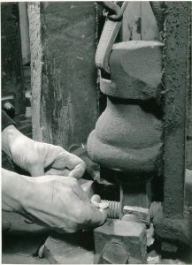 Het persen van de knopen in de werkplaats van Mansvelt.