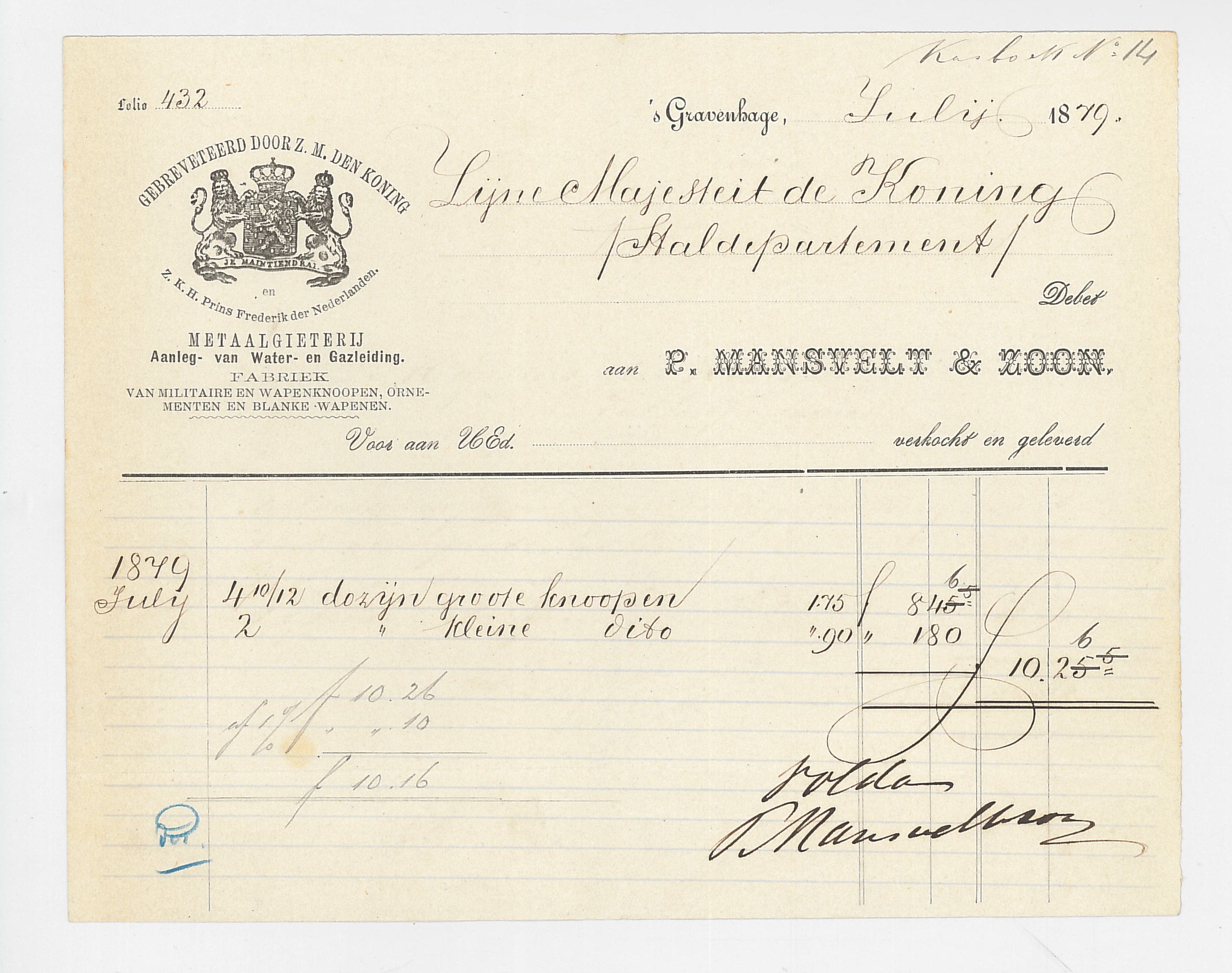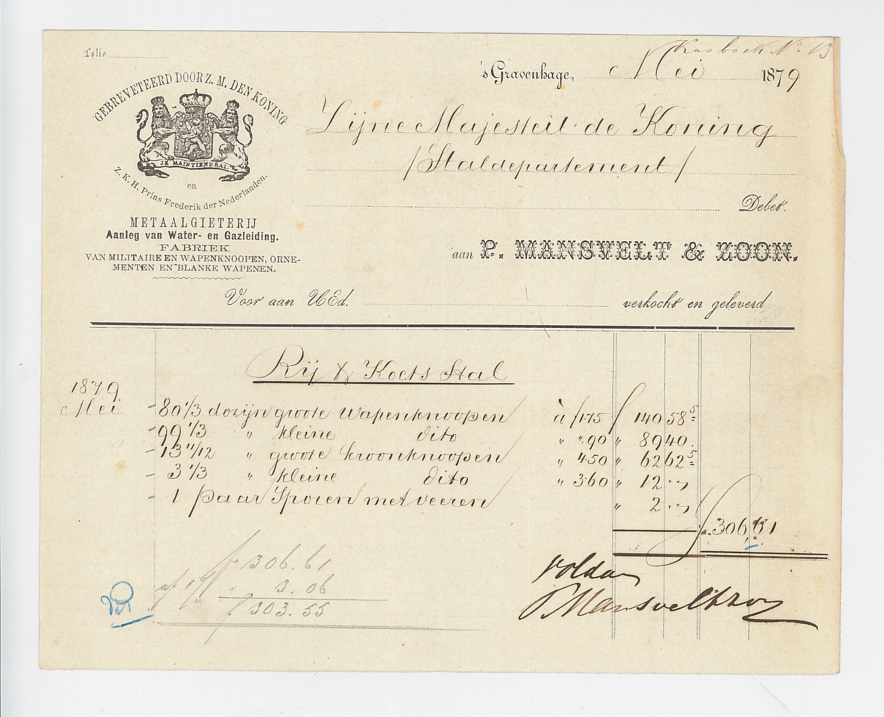 Facturen aan Koning Willem III. (Koninklijke Verzamelingen, Den Haag,