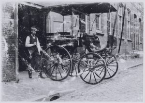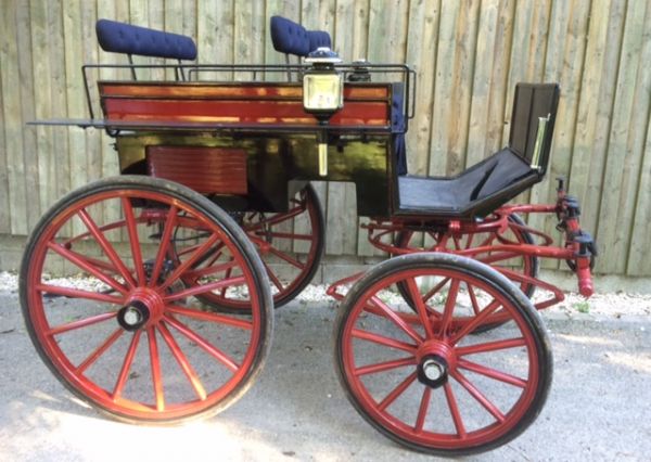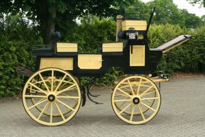 Vierwielige dogcart met Schutter & Van Bakel op de wieldoppen.