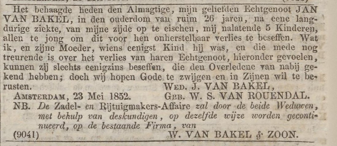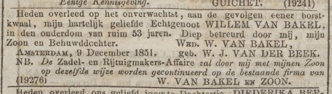 Aan het begin van de jaren 1850 slaat het noodlot toe. Willem overlijdt plotseling door ‘eener borstkwaal’, waarschijnlijk aan een hartaanval. In december 1851 laat hij, op 53-jarige leeftijd, een vrouw en zijn zoon Jan achter. In de overlijdensadvertentie laat zijn weduwe Willemina Johanna van der Beek weten dat zij en haar zoon de zadel- en rijtuigmakers-affaire continueren. Nog geen half jaar later echter overlijdt, na ditmaal een langdurige ziekte, ook Jan van Bakel. Slechts 26 jaar oud laat hij zijn vrouw Wubbina Susanna en vijf kinderen in ontreddering achter. “Wat ik en zijne moeder, wiens eenigst kind hij was, en die mede nog treurende is over het verlies van haren echtgenoot, hieronder gevoelen, kunnen zij slechts eenigszins beseffen, die den overledene van nabij gekend hebben.” In de overlijdensadvertentie is verder vermeld dat de zadel- en rijtuigmakers-affaire door de beide weduwen en door deskundigen wordt voortgezet. De zakelijke afwikkeling van deze overlijdens neemt bijna een jaar in beslag, maar een van de ‘deskundigen’ is een ervaren werknemer, Hendrik Anthony Schutter (1816-1876), als weesjongen in de leer gekomen bij Van Bakel.