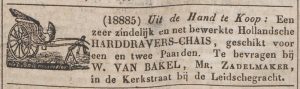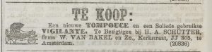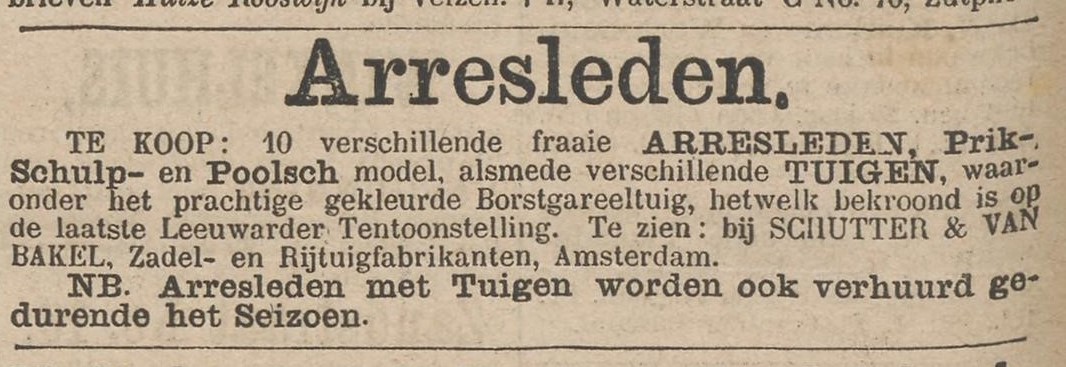 Ergens in de jaren ’80 komt de import op gang van Amerikaanse rijtuigen, sulky’s, fietsen en sledes, die ongetwijfeld tegen scherpe prijzen en als bouwpakket in een krat naar Amsterdam zijn verscheept. Een van de klanten die zo’n Amerikaanse slede, een zogenaamde cutter, aanschaffen is de regentenfamilie Van Loon aan de Keizersgracht. Want zijn het in de zomer de rijtuigen die het goed doen, ’s winters is er reclame voor wel tien verschillende modellen arrensledes van ƒ 100,- tot 350,- en bellentuigen. De combinatie slee en tuig is in de winterperiode ook te huur en dat is handig voor de stadsbewoners met een krap koetshuis. Een innovatie is het borstgareeltuig dat op de tentoonstelling in Leeuwarden 1884 is bekroond. In datzelfde jaar schaft de nieuw op te richten Amsterdamsche Pakket Expeditie-Onderneming vier spantuigen voor de postwagens aan bij ‘de welbekende fabriek’. Met name aan zadelmakers en bekleders is aan de Kerkstraat constant gebrek. Het Nieuws van de Dag komt in november 1886 met een nieuwtje: “In de rijtuigfabriek van de firma Schutter & Van Bakel staat een bijzonder fraai rijtuig op het punt afgeleverd te worden aan den besteller, een Samarangschen Majoor-Chinees. Het rijtuig, in den saamgestelden vorm van landauerberliner, onderscheidt zich door sierlijke en toch eenvoudige lijnen, lichten gang, en zorgvuldige afwerking Het schilderwerk is onberispelijk; de ruiten van geslepen kristal, het binnenwerk van geel zijden damast en de zilveren lantaarns en bokleuning zullen der welvarendsten Chinees niet tot oneer strekken. Eene bijzonderheid is, dat de staanplaats voor de lakeien, aan de achterzijde van het rijtuig, aangebracht is onafhankelijk van de veeren.”