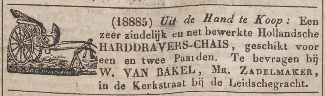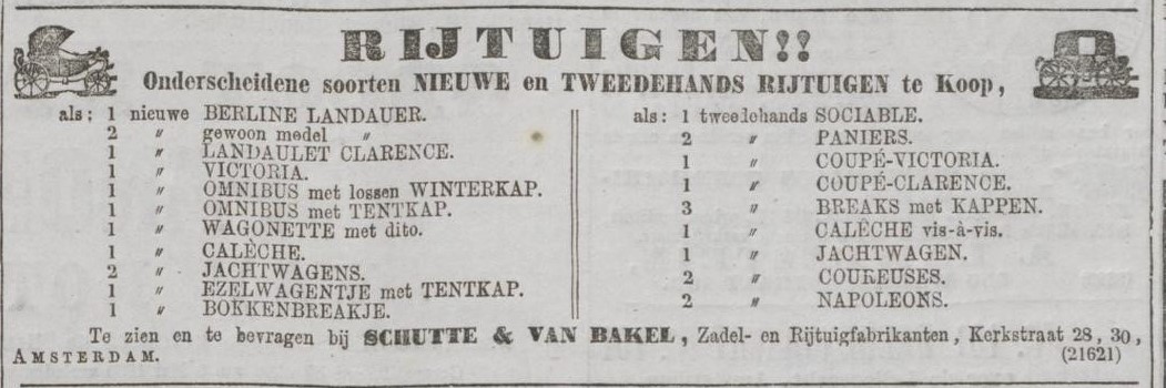 De firma Schutter & Van Bakel bepaalde bijna 125 jaar het aanzien van de Kerkstraat tussen Leidsegracht en Leidsestraat in Amsterdam. Die geschiedenis begint met Willem (Willebrordus, 1798-1850) van Bakel die op 1 juli 1829 als meesterzadel- en rijtuigmaker aan de slag gaat in een stal annex koetshuis aan de Kerkstraat, het huidige nummer 21. Het zijn nog niet gelijk indrukwekkende karossen die Willem levert, maar het is wel verfijnd werk zoals in de lijn van de 18e eeuw een ‘zeer zindelijke en net bewerkte’ Hollandse harddraversjees. Zo’n rijtuigje vergt het nodige vakmanschap in de zin van hout buigen, snijden en vergulden. In een andere advertentie biedt hij een modieuze schulpslede aan met een briljant arrentuig. Hij wil evengoed een paard slijten. Het is allemaal voor de gegoede burger, het betere middensegment dat behoefte heeft aan glazen- en tentwagens en tilbury’s. Nieuwbouw en handel lopen door elkaar. Zo tussen de regels door is op te maken dat Willem van Bakel wel ambitieus is. Hij verkoopt liever een gouden koets dan een ventkar. Zo adverteert hij met een ‘brietska’ (britschka), een ‘ vierwielige cabriolet’ en een ‘zo goed als nieuwe’ sociable, gebouwd door Visser & Co, de fabriek die dan het hoogste Amsterdamse segment bedient. Dat laatste is wat hij voor ogen had door daar te beginnen: in de straat met de koetshuizen van de bewoners op de Prinsen- en de Keizersgracht, de rijksten van de stad, althans dat waren ze. Willem heeft de pech dat juist die categorie een beetje berooid is geraakt in de Franse tijd en nu is het ook niet bepaald zo dat die rijke lieden zelf regelmatig door de Kerkstraat lopen: ze laten hun koetsiers voorrijden op de gracht en zien Willems zaak niet eens, terwijl het stalpersoneel dat er wel passeert zijn eigen belangen in de handel in rijtuigen en tuigage heeft. De Kerkstraat is in de loop der jaren zelfs wat verpauperd en dat helpt al evenmin. Hij heeft één groot voordeel, want de concurrentie in Amsterdam is zwak. Van de grote namen in de Amsterdamse rijtuigbouw van de 18e eeuw als Peter Sturck, Mulder en Klaes Kroon op het Haarlemmerplein, Calleree of Dirk Bontenakel is alleen nog Visser op de Botermarkt in de Franse recessie overeind gebleven. Maar financiële slagkracht om echt de markt te veroveren is er niet: in het kadaster van 1832 is te vinden dat Willem -zoon van een eenvoudige timmerman- geen eigenaar is van het pand in de Kerkstraat, maar Claesje Veldhuijs, zelf wonend aan de Keizersgracht. Hij huurt de bovengelegen woning en het koetshuis dat bij tijd en wijle zo donker is dat Willem een rijtuig buiten op straat moet schilderen en dat is niet al te hoogstaand. Meewerkend zoon Jan van Bakel woont volgens het bevolkingsregister naast zijn ouders op nummer 19.