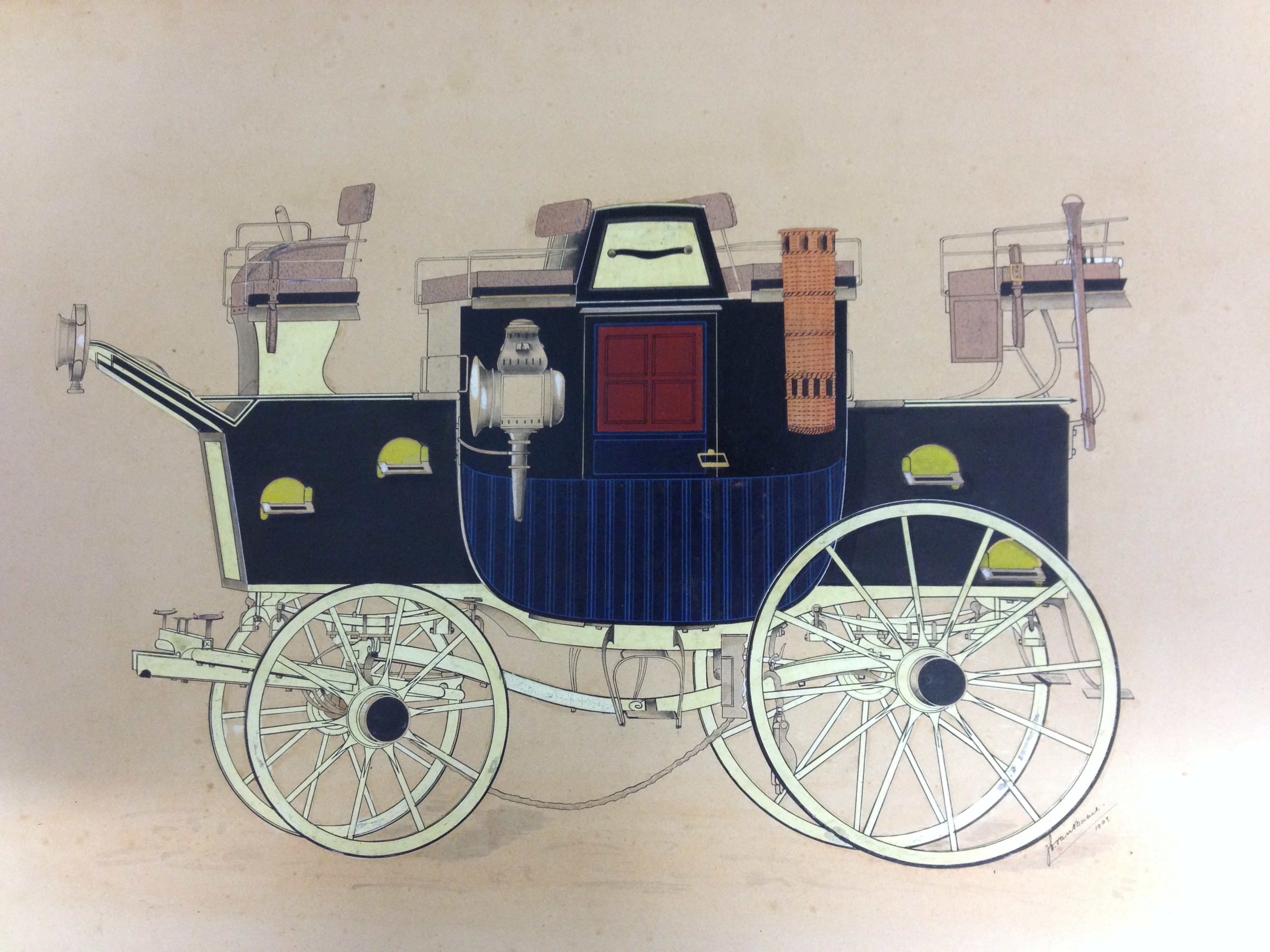 beeld boven: ontwerp van een landauer, getekend en ingekleurd door Jacob van Bakel, 1905. Collectie Nationaal Rijtuigmuseum.