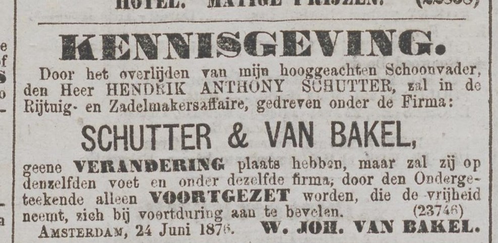Als Willems weduwe op 14 mei 1853 verhuist, neemt de familie Schutter zijn intrek aan de Kerkstraat 21. De jongere weduwe en haar kroos blijven er daarentegen nog altijd naast wonen, één van die kinderen (Willem Johannes) van Bakel treedt als zadelmaker in de voetsporen van zijn opa en zal in 1870 trouwen met zijn buurmeisje Hendrika Agatha Schutter. Daarmee zijn de namen ‘Schutter & Van Bakel’ verzegeld, ook in het bedrijf. Het is die kleinzoon die, een jaar voor het overlijden van zijn schoonvader, verantwoordelijk is voor de inzending op de Wereldtentoonstelling van 1877 in Amsterdam met een arrentuig. Het Algemeen Handelsblad is er lovend over: “Het narretuig van de heeren Schutter en Van Bakel is in oud-Hollandsche stijl bewerkt: een zogenaamd katjestuig. Eigenaardiger (bedoeld wordt: beter, red.) zou het dus geweest zijn, indien er geen gareel- maar een borsttuig van gemaakt ware. Doch niemand zal den inzenders dat offer aan den hedendaagschen smaak ten kwade duiden, nu de uitkomst inderdaad zoo goed is geweest. Het helder roode lederwerk, met zwart wit geschakeerd, zal zich bepaald aardig afteekenen tegen het blanke sneeuwkleed.”