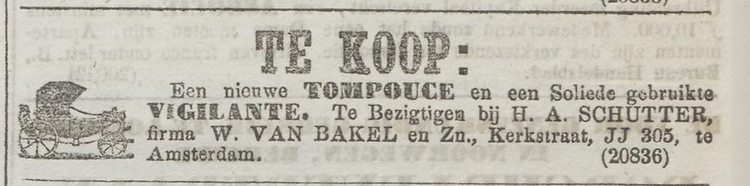 Onder de naam H.A. Schutter, firma W. Van Bakel en Zoon verandert er weinig aan de zaak: het is nog zowel zadel- als rijtuigmakerij en het meest luxe zijn coupés en vigilantes die uit de werkplaats komen. Het tijdperk ‘Schutter’ gaat 22 jaar duren. Maar het is misschien allemaal iets minder ambitieus dan de grondlegger in gedachten had. In voorraad zijn altijd een drie tot zeven nieuwe en tweedehandsrijtuigen, waarvan een veelvuldig aangeboden ‘tompouce geheel met zijde bekleed’ misschien wel de gekste is, een miniatuurrijtuigje voor het laten optreden van de dwerg Tom Pouce.