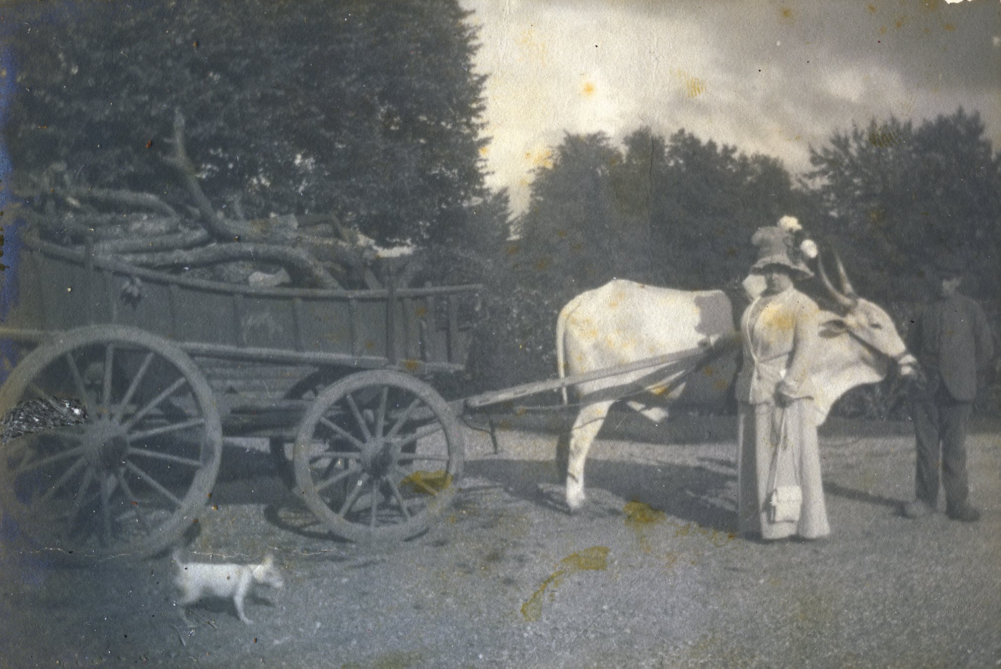 Ceylonese os voor de oer-Hollandse boerenwagen die de tuinlieden van De Haar voor het dagelijkse werk gebruikten. Het was een bijzondere combinatie en zo te zien vond Hélène het wel grappig.