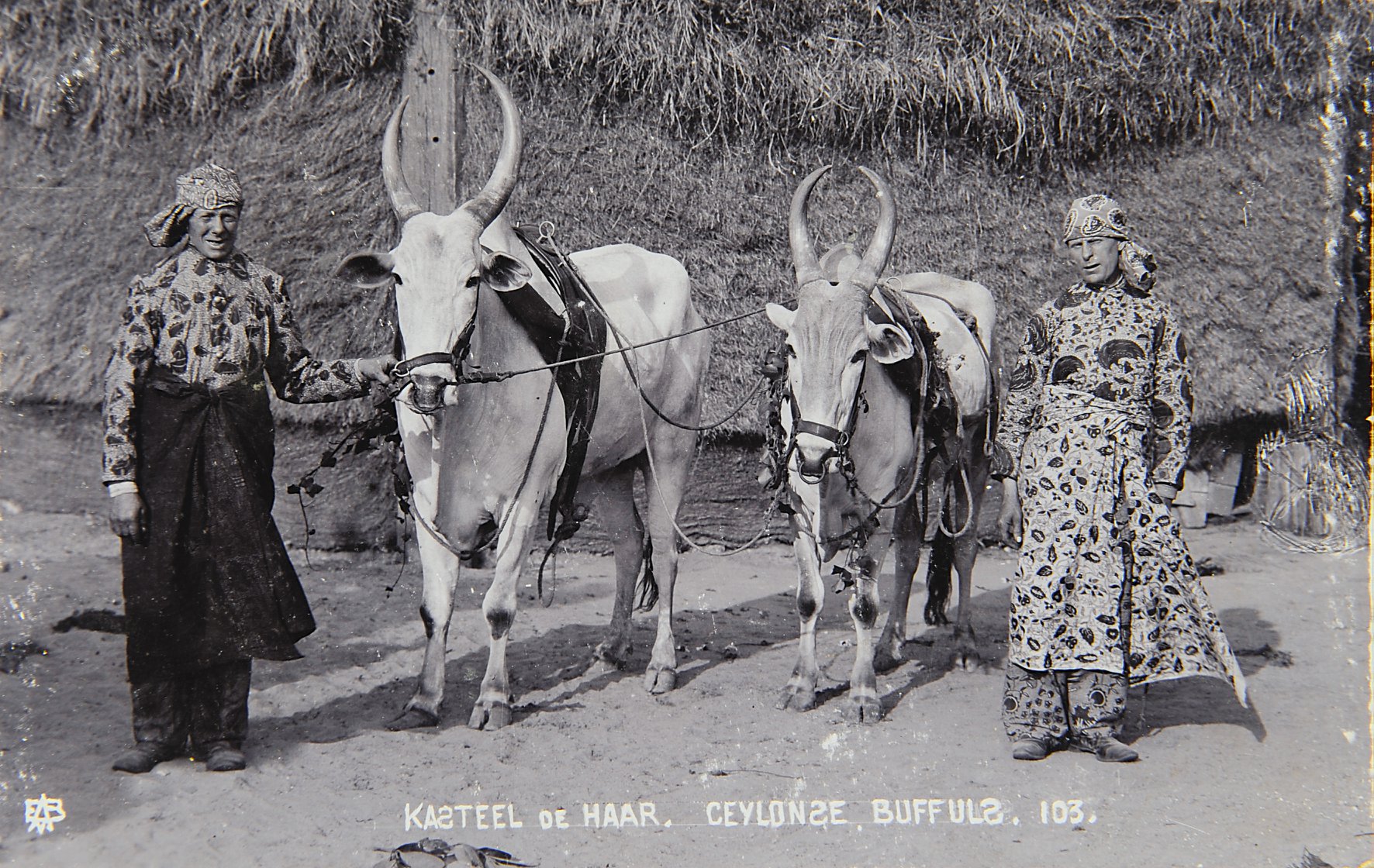 Als Hélène de Rothschild op een kiekje poseert achter zo’n hackery cart is gelijk duidelijk hoe klein het karretje in werkelijkheid is. Klein genoeg om van Ceylon mee naar huis te verschepen. De Singalese naam is thirikkale. ‘Hackery’ is een verbastering van het Engelse ‘hackney’, wat zo veel betekent als huurpaard. Maar met pony’s of paarden hebben de tweewielertjes niets te maken. Het waren een handige taxikarretjes getrokken door, in dit geval, een kleine os. Het juk tussen de bomen van de karretjes geeft dit al een beetje aan; ook de ossen hier ten lande in de veenontginning trokken hun last met een juk.