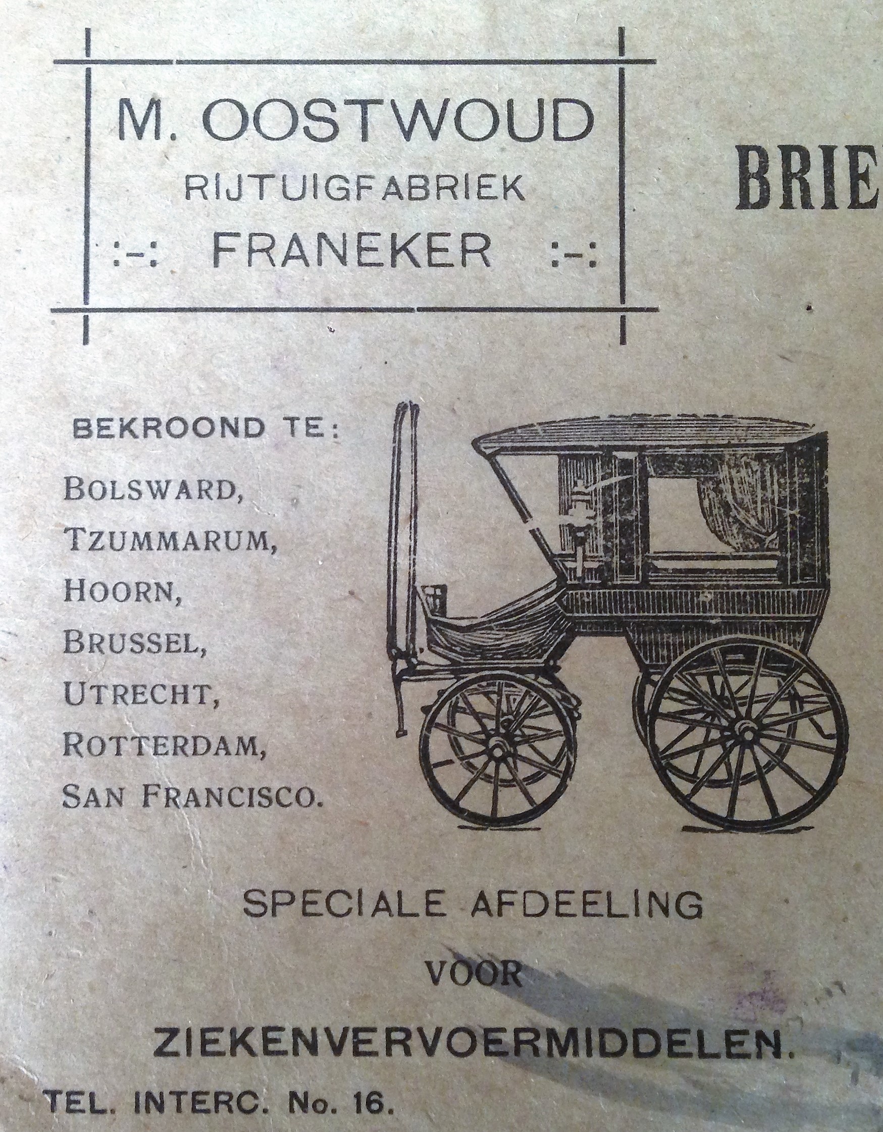 Het Nationaal Rijtuigmuseum in Leek bezit een ezelwagonette, met aan weerszijden een rond etiketje en daarop ‘M. Oostwoud Stoomrijtuigfabriek Franeker’. Het wagentje is gebouwd in de periode na 1908. Oostwoud in Franeker is tegenwoordig de specialist in medisch meubilair. Dit moderne bedrijf dankt zijn bestaan aan een rijtuigbouwer die ziekenvervoer als gat in de markt zag. Het is een onstuimige geschiedenis die iets leert over arbeidsverhoudingen en economische veranderingen.