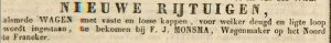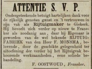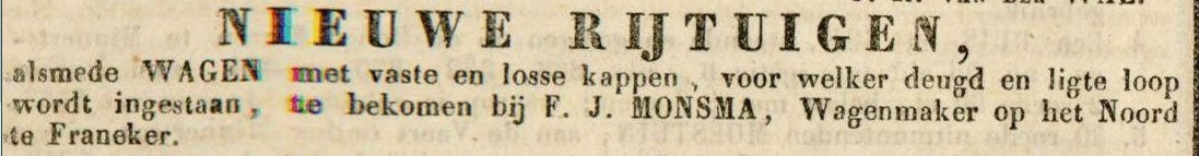 Franke heeft zijn zinnen gezet op ‘t Noord in Franeker, waar Fekke Johannes Monsma (1822-1889) aan de kost komt als koopman, winkelier in touwwerken en vanaf 1845 als rijtuigmaker. Dat laatste doet Monsma perfect, met wel zeven tot tien knechten aan het werk. Fekke adverteert met rijtuigen ‘voor welker deugd en ligte loop wordt ingestaan’.