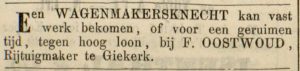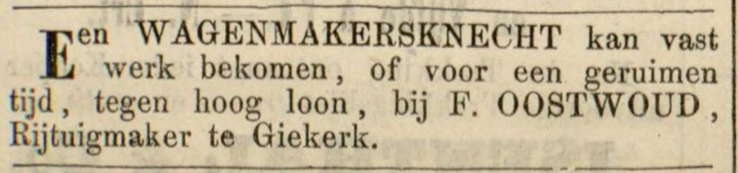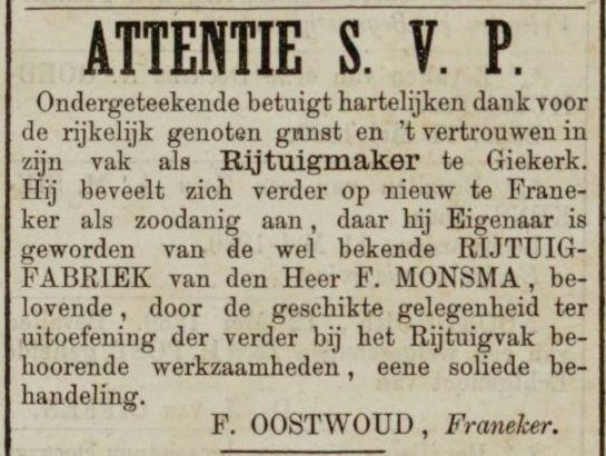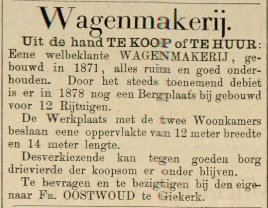 Het verhaal van Oostwoud als onderneming begint op twee plaatsen. Bij Franke Oostwoud (1844-1899) die in Giekerk begint als wagenmaker. Als hij trouwt met een nicht van moederszijde, Froukje Koksma, is het na een jaar gelijk raak: in 1874 komt degene ter wereld die vaders bedrijf zou gaan uitbouwen tot een heuse fabriek, Marten (1874-1936). Maar voor het zo ver is neemt vader Franke alvast een grote stap door in 1879 de wagenmakerij in Giekerk te koop te zetten. “Uit de hand te koop of te huur: eene welbeklante wagenmakerij, gebouwd in 1871, alles ruim en goed onderhouden. Door het steeds toenemend debiet is er in 1878 nog een bergplaats bij gebouwd voor 12 rijtuigen. De werkplaats met de twee woonkamers beslaan eene oppervlakte van 12 meter breedte en 14 meter lengte. Desverkiezende kan tegen goeden borg drie-vierde der koopsom er onder blijven. Te bevragen en te bezigtigen bij den eigenaar.” Het kost een jaar om een klant te vinden en dat zal best wat hoofdbrekens hebben opgeleverd, want er was al een bod gedaan op een grotere wagenmakerij in een stad met nog meer klandizie.