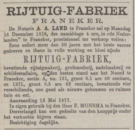 Maar Fekke wil op zijn beurt in 1876 naar Leeuwarden om daar een winkel te openen. Na een vergeefse poging om de rijtuigmakerij onderhands te verkopen, vindt er in december een veiling plaats van de opstallen en de grond: “Vier gebouwen, zoo goed als nieuw, met erve en grond, zeer gunstig staande en gelegen aan het Noord te Franeker, waarin sedert meer dan 30 jaren met het meeste succes eene rijtuigmakerij, smederij en daaraanverwante zadelmakerij en verwerij wordt uitgeoefend, welke affaire thans in vollen bloei is.” Er is sprake van een ‘grofsmederij’, een wagenhuis met ‘massale steeg’ en ‘regenbak’.