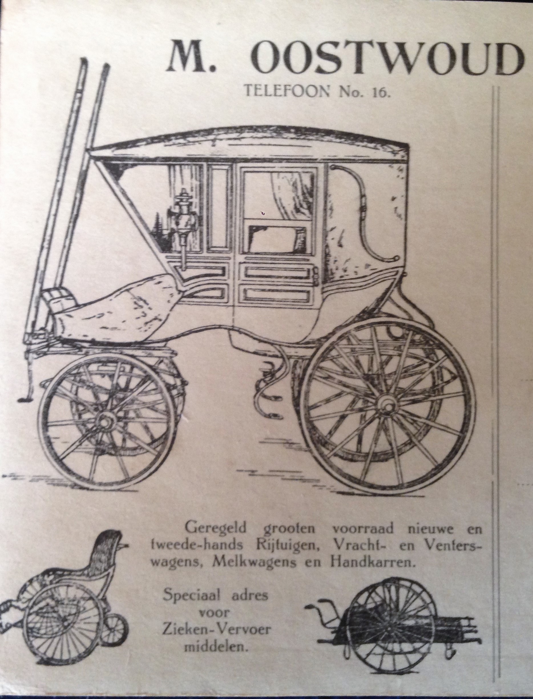 Ondanks het succes van het ziekenvervoer bleef Oostwoud een breed scala leveren: in het briefhoofd staat ‘smederij – zadelmakerij – rijtuigschilder’. Voor wie een paar bellen van een arrentuig te kort komt gaat naar Oostwoud, een oud rijtuig opnieuw schilderen kan bij Oostwoud en het bedrijf heeft een ruime sortering zwepen, leidsels en rijtuiglantaarns. Oostwoud bouwt ook ‘ouderwetse’ rijtuiglantaarns om van kaarsen naar ‘moderne’ acetyleenbranders. Dat laatste is een leuke noviteit, voor ƒ 9,- per stuk. Enige probleem: je kunt zo’n brander niet zo gemakkelijk doven als een kaars. Al het messingbeslag als gespen en beugels voor tilbury’s laat Oostwoud maken bij kopergieterij Keverling in Joure. Tot 1930 gemaakt, exclusief ziekenvervoer: 312 hondenkarren, 679 handkarren, 312 bedrijfswagens, 25 lijkkoetsen, 64 volgwagens, 98 ‘omnibusjes’, 9 tentwagens, 56 barouchettes, 16 barouchettes met zijdeuren, 3 landauers, 8 coupés, 12 krompanelensjezen, 17 tilbury’s en 24 unieke rijtuigen. De briefkaarten die het bedrijf voor eigen correspondentie laat drukken geven een leuk beeld van de populairste modellen: 1915 is het een barouchette met zijdeur, in 1917 een ‘omnibusje’. Die laatste stond die in tijd beter bekend als ‘glazen wagentje’ en tegenwoordig noemen we het een kerkbrik.
