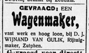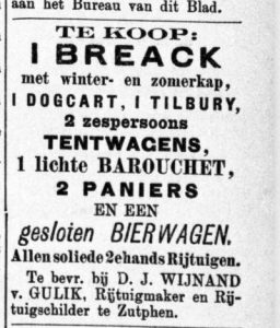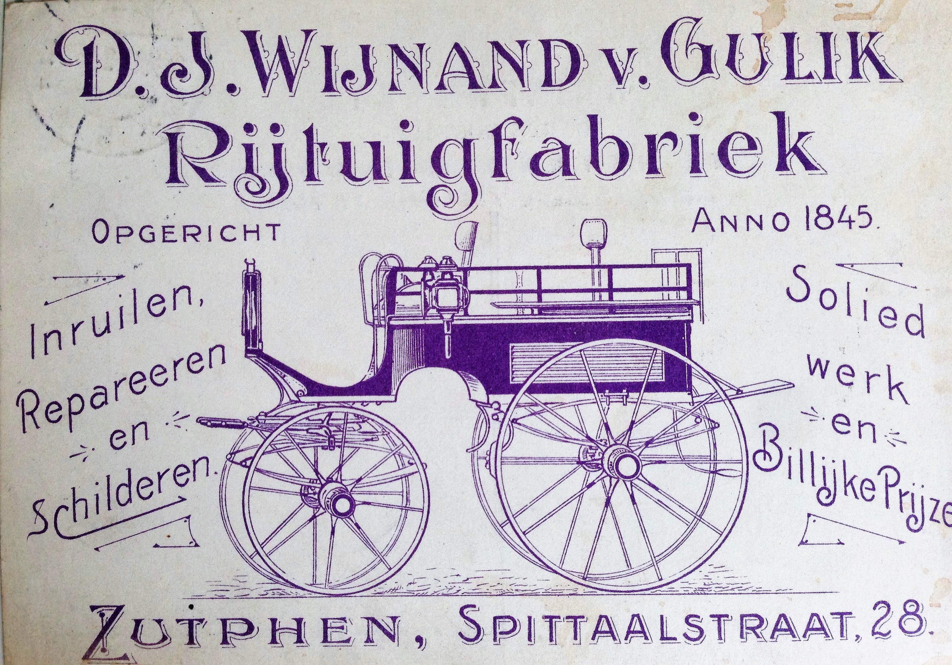 Een reeks Wijnands van Guliks, zonen en broers met in hoofdzaak de voorletters ‘D.J.’ drukt zijn stempel op de stofdoppen van wagens en rijtuigen. In hun Zutphense Rijtuigfabriek aan de spittaalstraat 28 bouwen ze omnibussen, tilbury’s, barouchetten en tentwagens. Bedrijfswagens ook. Maar de grootste omzet komt uit de handel in tweedehandsrijtuigen. Met af en toe iets bijzonders. Zo adverteert Wijnand van Gulik in 1912 met een ‘fraai gebeeldhouwde’ Friese sjees in de Leeuwarder Courant. De vraagprijs voor deze ‘gelegenheidskoop’ is ƒ 125,-.