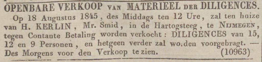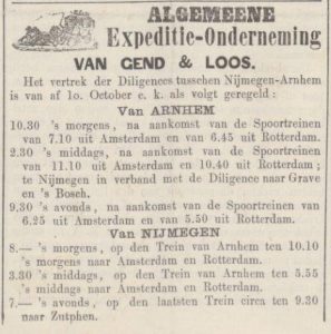 Van de Arnhemsch Courant van 2 oktober 1867 weten we hoe zijn werkschema er ongeveer uit zag. De diligences liepen driemaal daags en dat hing af van de aankomst- en vertrektijden van de treinen op het station Arnhem, naar Rotterdam en Amsterdam. In Nijmegen sloot de lijn aan bij die van de diligence naar Grave en Den Bosch. In de tijd van Willem was dat al heel modern, want het doortrekken van de spoorlijn naar Arnhem had in 1845 het hele post- en personenvervoer veranderd. Daarvoor reden de grote diligences, die Nijmegen en Arnhem passeerden, nog de gehele route van Rotterdam naar het Duitse Münsterland. Willem hoefde niet zo ver meer en zat ’s avonds keurig thuis aan de gestampte pot. Hij reed bovendien mee op een relatief kleine wagen, want toen in 1845 de spoorlijn tot stand kwam deed het vervoersbedrijf in Nijmegen prompt de wagens voor 15, 12 en 9 personen in de verkoop, openbaar en ten huize van de smid in de Hartogsteeg. Maar dat heeft Willem mogelijk niet zo bewust meegemaakt, hij was nog maar tien.
