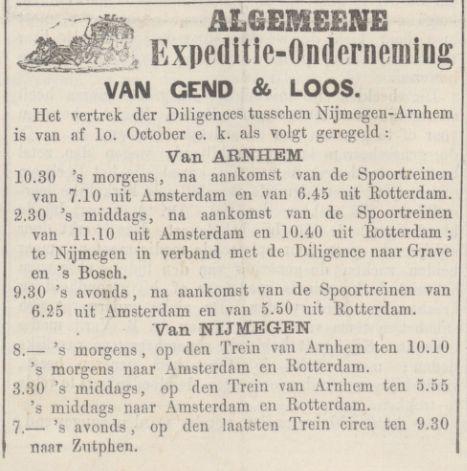Een opmerkelijk bericht in de Arnhemsche Courant van 29 augustus 1871: “De ondergeteekende, conducteur bij de Expeditie-Onderneming Van Gend & Loos, (Nijmegen—Arnhem), in de nachtdienst van 21 Julij j.l. te Elst, door een ongelukkig toeval onder de wielen der diligence geraakt zijnde, waardoor hij zulke belangrijke verwondingen en kneuzingen bekwam, dat zijn leven er door in gevaar was, acht zich verpligt openlijk zijn opregten dank te betuigen voor de menigvuldige bewijzen van menschlievende deelneming, zoo van ziine stadgenooten als van elders, gedurende zijn lijden ondervonden. Vooral de WelEd. Heer F. D. Sneltjes ontvangt voor zjjne liefdevolle behandeling zijne warme erkentelijkheid”, was getekend Wilhemus Loomans, Nijmegen, 26 augustus 1871.