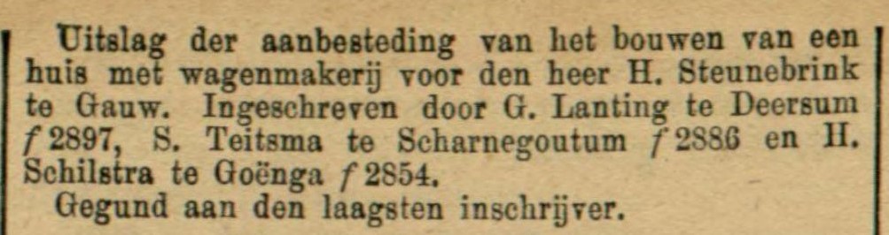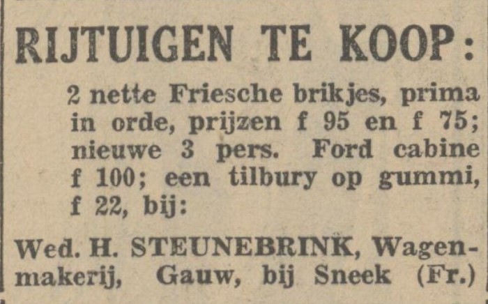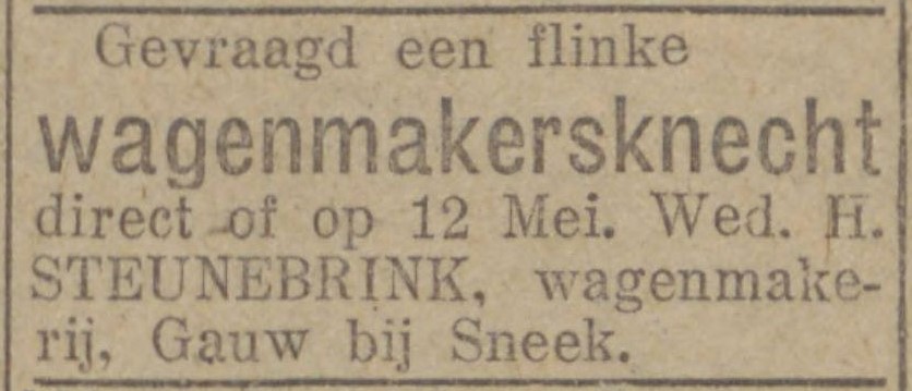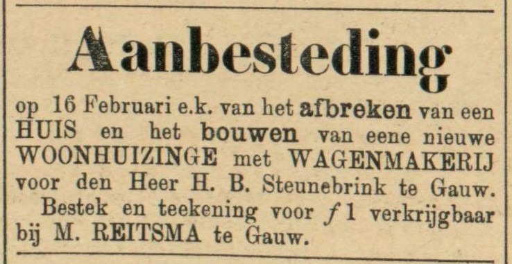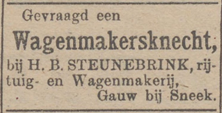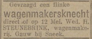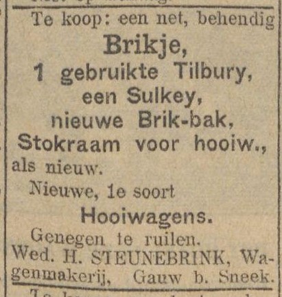 Op 11 augustus 1870 trouwde de van Dronrijp afkomstige Barend Steunebrink (1845-1929), van beroep smidsknecht, met Richtsje Wester van Terhorne. Diezelfde dag nog voeren zij met hun hebben en houden in een praampje naar Gauw, waar een oude smederij en een even bejaard huis het jonge paar wachtte. Barend kwam in een streek met veel boeren en die hadden dringend behoefte aan een wagenmaker. Zodoende verrees weldra achter het pand een wagenmakerij. Voor dit laatste vak moest die eerste Steunebrink twee inwonende knechten in dienst nemen en zijn zoon Heerko (1872-1923), die hem in 1903 opvolgde, dreef ook nog een dubbele zaak: smederij én wagenmakerij. Heerko liet in dat jaar een wat groter huis en een werkplaats langszij bouwen. Na inschrijving door drie aannemers, kreeg H. Schilstra uit Goënga die klus gegund voor ƒ 2.854,-. Ter vergelijking: om dat nieuwe huis te betalen moest Heerko wel dertig nieuwe boerenwagens verkopen. Maar Heerko had vooral plezier en kunde in het luxere rijtuigwerk; hij zou de tilbury met het verfijnde houtsnijwerk voor de latere Van der Leen maken.