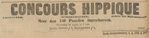 Daar zit tegelijkertijd het spoor dat ons brengt op het eerste concours hippique achter het Rijks, op 12 oktober in het jaar van de opening, 1885. Dit is tegelijk het allereerste concours hippique dat in Nederland plaatsvindt. In het uitvoerend comité zitten: mr. C.J. den Tex Bondt, jhr. G. den Tex, Baron de Salis. Jury: Baron van Brienen van de Groote Lindt, Voorzitter, Clingendaal, J. C. v.d. Oudermeulen, Wassenaar, jhr. H. Clifford, ‘s-Hage, H. van Wickevoort Crommelin, Haarlem, majoor F. Ypey, Leiden, Th. A. van den Brock, Amsterdam, W. van der Vliet, Amsterdam, E. v. Hoboken v. Oudelande, Rotterdam. Wie de namen van die pappenheimers iets zegt, weet dat het allemaal welgestelde lieden van de – in hun tijd- oude stempel waren. Renteniers vooral.