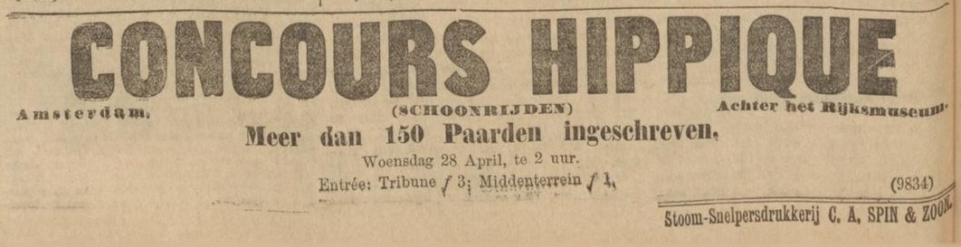 Het is pas in 1880 dat in Parijs een concours hippique is georganiseerd en deze heren grijpen vijf jaar na dato de opening van het Rijksmuseum aan om Nederland te laten kennismaken met de paardensport in deze vorm: vooral voor het jureren op ‘de mooiste’ rijtuigpaarden, dravers en rijpaarden, waarbij in de laatste categorie de militairen hun eigen rubrieken krijgen. De tuigpaardensport in Nederland bestond al wel, maar vond plaats als onderdeel van landbouwtentoonstellingen en dat is de heren niet chique genoeg. Nog voor het concours een feit is vind een discussie plaats over de manier van jureren op het concours hippique, want dat is anders dan op de landbouwshows waarbij het puur om de kwaliteit van het paard gaat. De jury let nu op het ‘schoonrijden’ en dat is de combinatie van paard en de manier van rijden. Ene anonieme brievenschrijver ‘X’ in het Algemeen Handelsblad van 6 oktober is kritisch: “Zonder twijfel zal toch in ieder geval moeten vaststaan, welk aandeel de rijkunst (op het programma zeer stiefmoederlijk behandeld) in de bekroning heeft. Met dit laatste staat of valt het concours, en in dit opzicht laat het programma ons geheel in de steek.” Maar de schrijver noemt gelijk iets om als voorbeeld te nemen: “Men behoeft slechts een zondag de in het Vondelpark geëtaleerde equipages te bezien, om daarvan de meest positieve wetenschap te erlangen.”