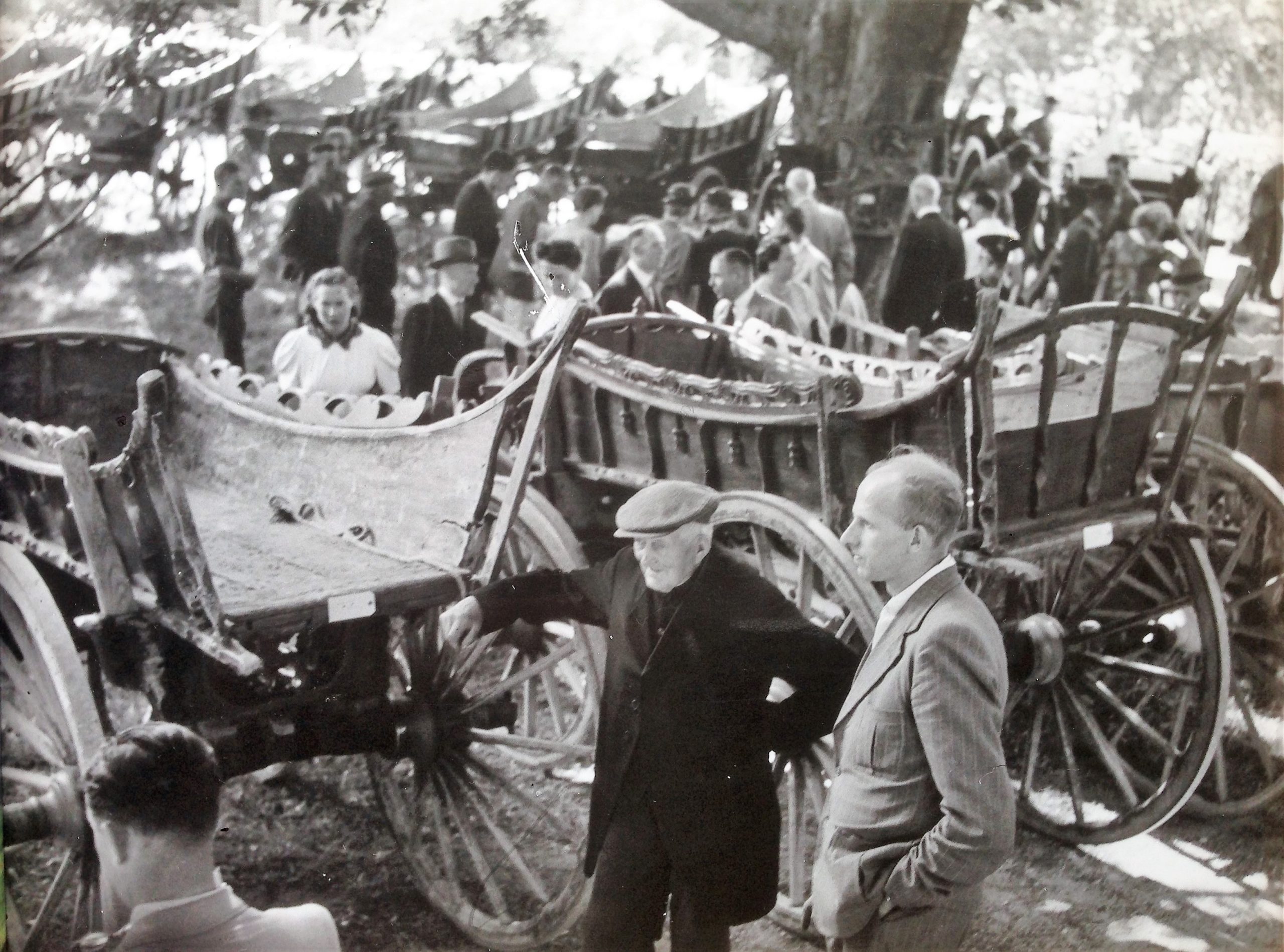 Boer en burger bewonderen 24 wagens tijdens de eerste Boerenwagendag in Beesd, 1946.