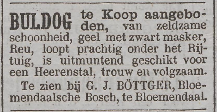 Johannes Godfried Böttger (1779-1859) was voor hij naar Bloemendaal kwam winkelier in Zierikzee. Als de heer Van der Burcht van Lichtenberg in 1817 van Zierikzee naar Bloemendaal verhuist, wordt Johannes koetsier op zijn buitenplaats Hartelust. Samen met zijn vrouw Anna betrekt Johannes de dienstwoning op de hoek Zomerzorgerlaan-Verlengde Koepellaan. Hun zoon, Godfried Johan (1823-1903) is één van de eerste postbodes in Bloemendaal. Naast die werkzaamheden heeft deze Godfried een stalhouderij naast zijn woonhuis aan de Zomerzorgerlaan. In die tijd (1882) zet hij een buldog te koop in het Nieuws van den Dag: “Van zeldzame schoonheid, geel met zwart masker, reu, loopt prachtig onder het rijtuig, is uitmuntend geschikt voor een Heerenstal, trouw en volgzaam.” Zo’n advertentie bewijst dat Böttger wel weet wat modieus is in de particuliere koetshuizen om hem heen. Voor een dame is er namelijk niets zo chique als een koningspoedel onder de achteras van het rijtuig, terwijl een heer liever gevolgd wil worden door een Deense dog of buldog. Zo gaat het namelijk in het Parijse Bois de Boulogne en dan is dat minstens zo chique in Bloemendaal.