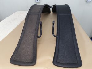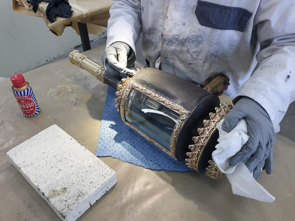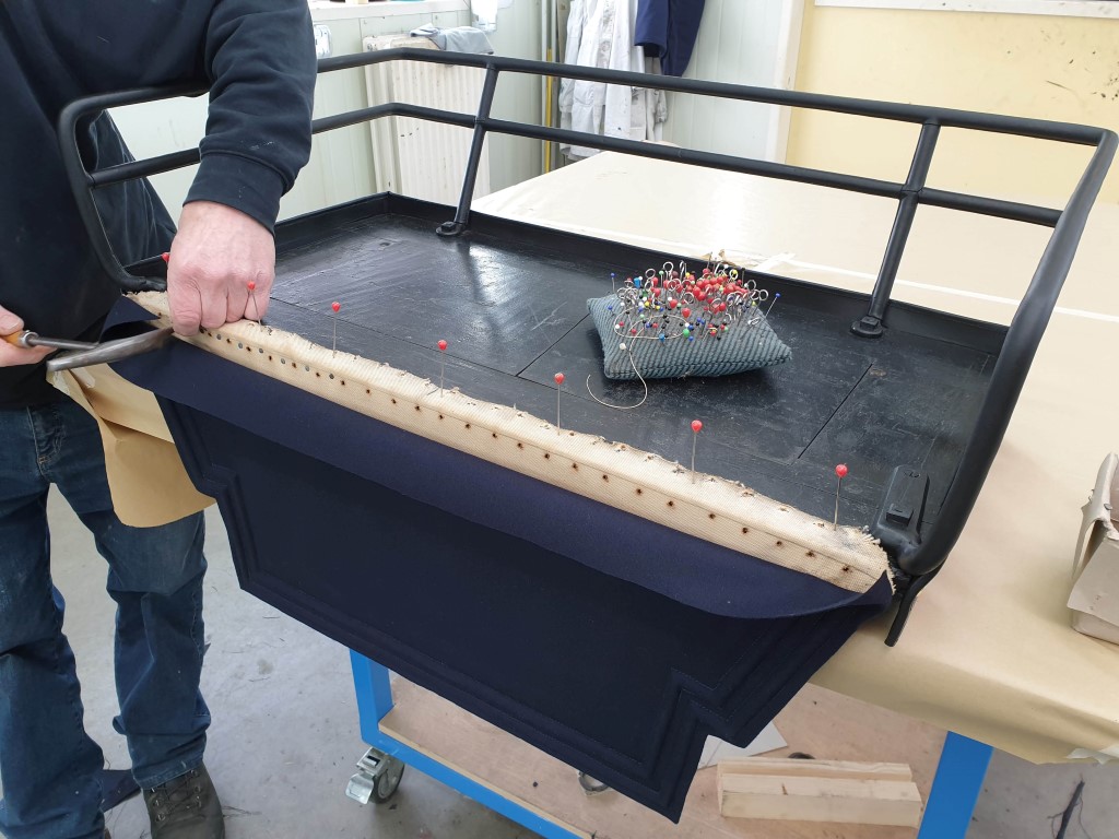 Toch is restauratie-centrum Stolk met dezelfde precisie te werk gegaan als met de vorige twee rijtuigen van De Haar: van een versleten volant is bijvoorbeeld de voorkant vernieuwd, maar de oude achterkant opnieuw gebruikt, niet uit zuinigheid, maar om het erfgoed zo volledig mogelijk te behouden. De oude riemen waarin de bak hing waren echter niet meer te sparen: anders zou het rijtuig geheid in elkaar storten. De nieuwe leren riemen zijn wel, net als de oude, door een meesterzadelmaker ‘gebolleerd’ en vierdubbel met de hand gestikt. Het smeedwerk van onderstel was deels verroest en dat is -eveneens deels- opnieuw geschilderd. En voor de rest was het een kwestie van polijsten, het vuil oplossen en wegpoetsen met wattenstaakjes, kale plekjes aanvullen en mottengaatjes dichten. Dit rijtuig had ettelijke vierkante meters aan leerwerk te reinigen. Het resultaat is verbluffend.