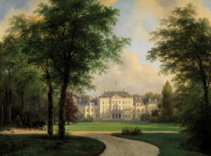 Paneel ‘Het Witte Loo vanuit het park gezien’ door Andreas Schelhout uit 1838 (beeld Paleis Het Loo, Apeldoorn, bruikleen van Geschiedkundige Vereniging Oranje-Nassau).