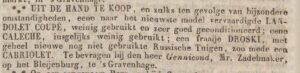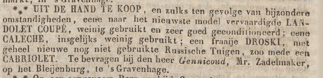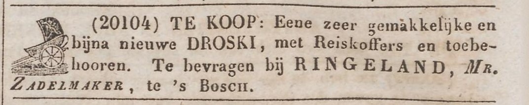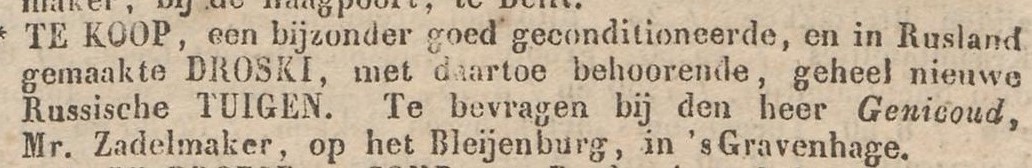 “Uit de hand te koop een Russische drowsky, te bevragen bij den boekhandelaar”, verschuilt de eigenaar die voor de eerste maal een dergelijke, exotische rijtuigje te koop zet in de krant, het Dagblad van ’s Gravenhage van 18 mei 1829, zich in de anonimiteit. Dat is een paar jaar later anders, wanneer de rijtuig- en zadelmaker J.S. Lehman op de Hoogstraat in Rotterdam een nieuwe drowsky ‘naar den laatsten smaak bewerkt’ aanbiedt in de Rotterdamsche Courant (17-8-1837). Dezelfde rijtuigmaker heeft er vaker één in de werkplaats staan, met geel koper ‘gemonteerd’, zoals dat heet, en dat is anders dan bijvoorbeeld een ‘caricle’ die hij met ‘wit chinees koper’ afwerkt.
