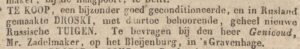 “Zoals men weet heeft de czaar aan keizer Wilhelm eene prachtige trojka geschonken met drie hengsten bespannen, zonder zelfs den moscovie’schen koetsier te vergeten; volgens Russisch gebruik waren de tuigen geheel met zilver versierd. Men schatte het geheel op 20.000 roebels. De keizer heeft zich dezen winter herhaaldelijk van dit span bediend om uitstapjes te doen. Onlangs bemerkte de koetsier met schrik, bij het schoonmaken der tuigen , dat de zilveren versierselen eene zeer verdachte gele tint begonnen te vertoonen. Na een oplettend onderzoek was er geen twijfel meer; de metalen versierselen waren van verzilverd koper. De keizer lachte hartelijk over het avontuur en spotte niet weinig met den Russischen gezant, graaf Schovaloff. Bij zijne laatste reis naar St.Petersburg verhaalde de gezant de geschiedenis aan den csaar, maar deze nam de zaak zo vroolijk niet op. Hij beval een onderzoek en men ontdekte den schuldige, een hoogen ambtenaar der keizerlijke stallen. Hij is aanstonds met verscheidene mindere beambten, zijne medeplichtigen, op pensioen gesteld.” (Delftsche Courant 19-4-1891).