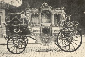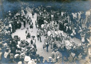 foto boven: de Gouden Koets met de schimmels van stalhouderij Nienhuis in Groningen, 1909. Beeld: Gemeentearchief Groningen