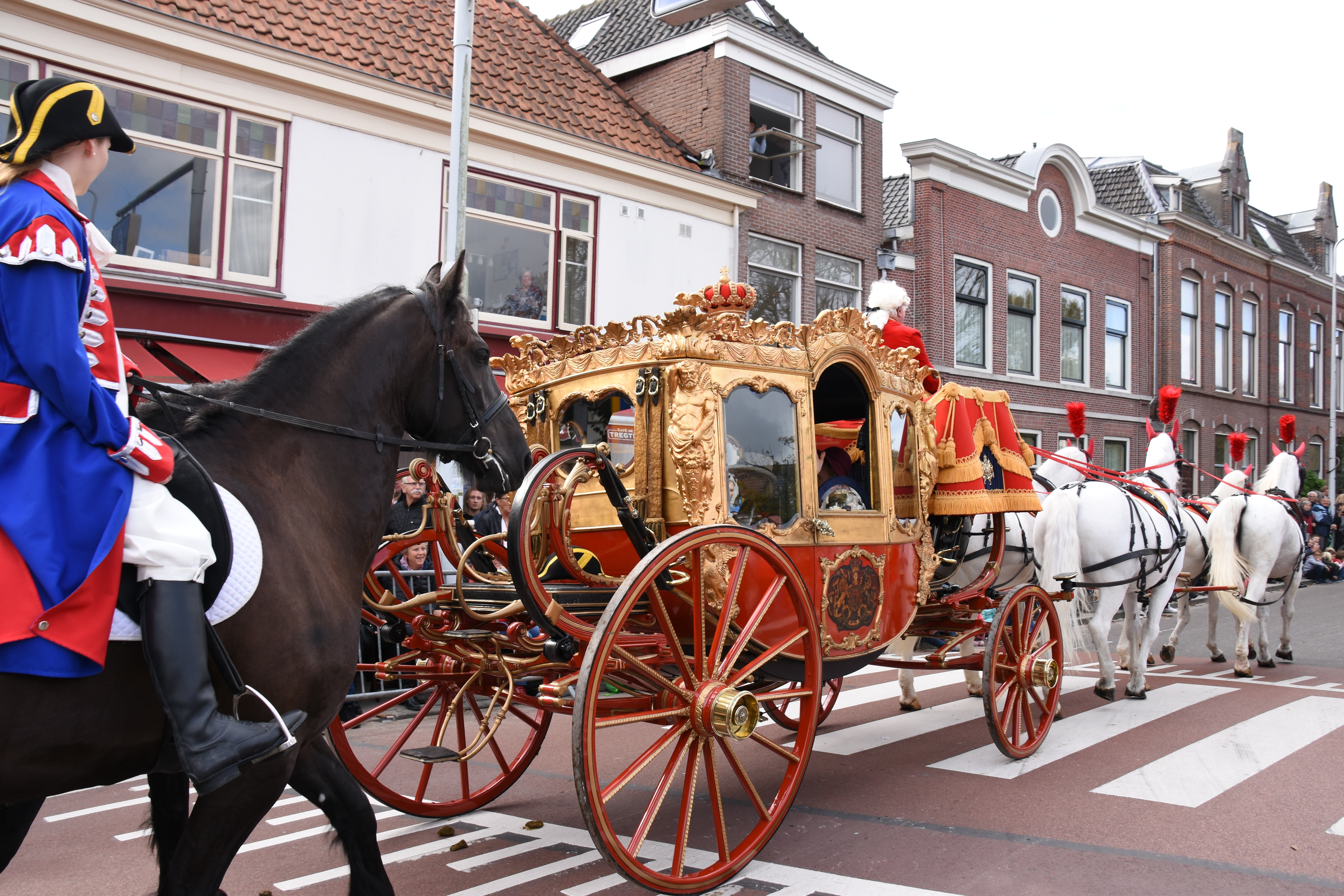 Nog altijd komt de gouden koets van Leiden op de weg, getrokken door schimmels en