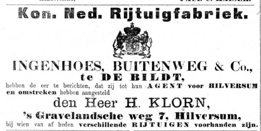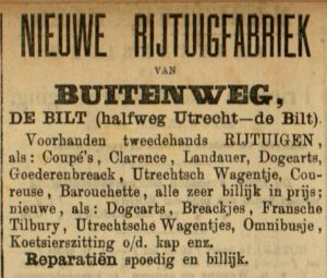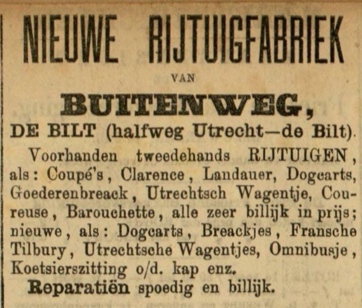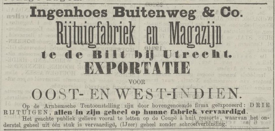 Adrianus Hendrikus Ingenhoes (1813-1905) en David Buitenweg (1811-1894) richten in 1837 een rijtuigfabriek op aan de Dorpsstraat in De Bilt. Ze maken en verhandelen alle luxe rijtuigen voor dienst- of sportief gebruik, van calèche tot napoleon. De Utrechtsche Provinciale en Stadscourant van 2 augustus 1858 doet verslag van een expositie voor kunstnijverheid: “Thans komen hier aan de beurt de modellen van de heeren A.H. Ingenhoes en D. Buitenweg van de Bilt, die hier in soorten aanwezig zijn, en met een vaste hand zijn gesneden, even als de tilbury-lemoen uit één stuk met een ferme hand moet gebogen zijn. Dit laatste stuk is, met het daarbijzijnde wiel, zeer te bewonderen, en beide verdienen evenzeer ieders opmerkzaamheid als de ijzeren modelstellen en een rijtuigstel, die allen met de uiterste netheid zijn behandeld, gelijk ook een schoone break voor zes personen en de coupé-vigilante.” Met name voor het buigen van twee lamoenbomen uit één stuk hout is een vakmanschap nodig, dat slechts een enkele rijtuigfabrikant verstaat.