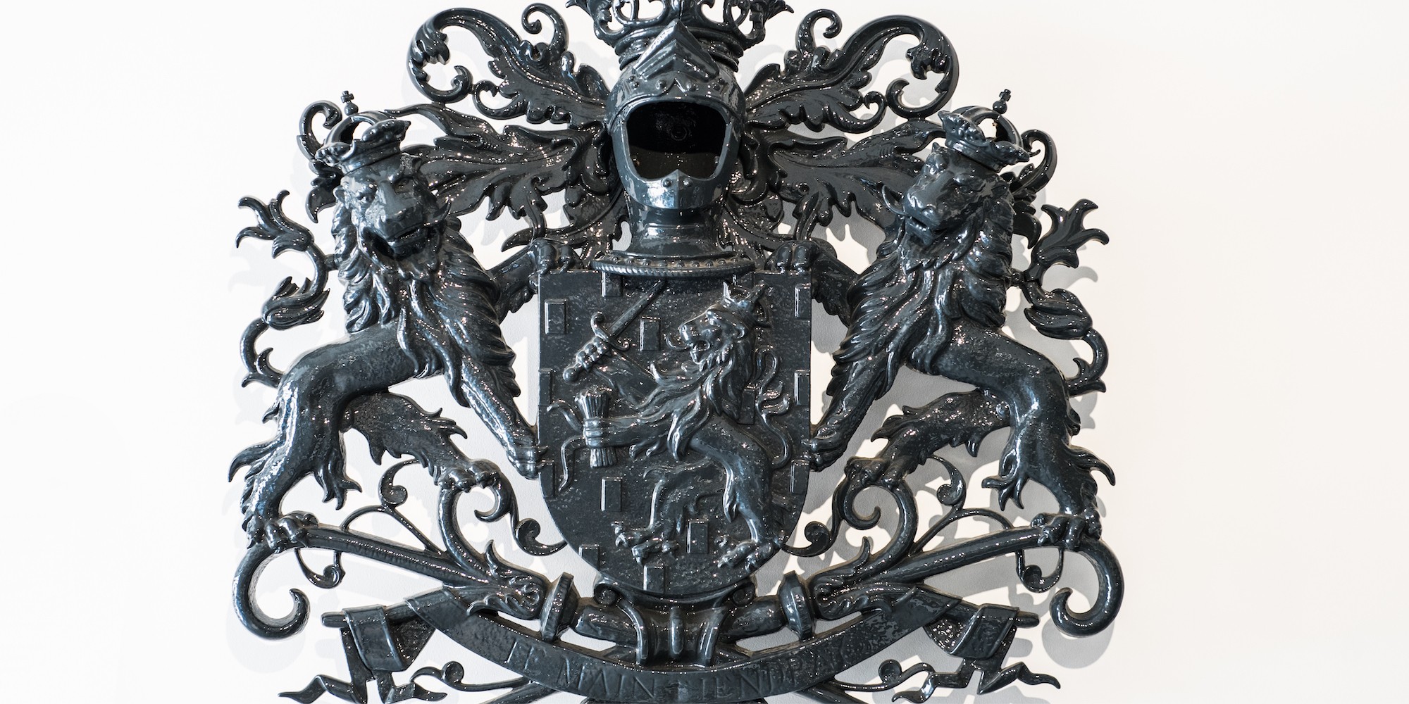 Gietijzeren hofleverancierswapen uit 1886, dat boven de poort van de fabriek hing, is nog bewaard.