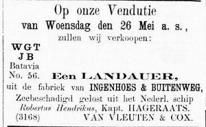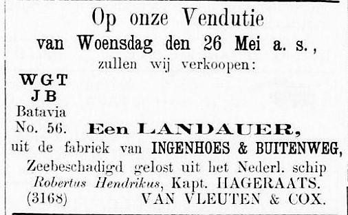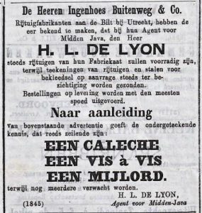 In 1893 haalt een inzending op een tentoonstelling in Batavia in de categorie ‘uitheemse nijverheid’ een zilveren medaille, hetzelfde resultaat als concurrent Spijker en Zoon mag ontvangen. Al vanaf de jaren ‘60 gaat er namelijk jaarlijks een tiental rijtuigen naar Nederlands Indië, waar H.L. de Lyon uit Semarang het agentschap heeft voor midden-Java. In de hoofdstad Batavia is het agentschap voor Van Vleuten & Cox, het veilinghuis van de betovergrootvader waar de cabaretier Diederik van Vleuten naar is vernoemd. Ze werken in commissie. Landauers, coupés, victoria’s, tentwagens, voor alle modellen die de ambtenaren en plantagehouders in Nederland gewoon waren, is markt in het verre oosten. De rijtuigen komen aan met stoomschepen als de President Rijckevorssel en de Prinses Anna Elizabeth en na het lossen plaatste zo’n agent een advertentie met de term ‘ontpakt’, waarmee is aangegeven dat een rijtuig in zijn geheel aankwam, mits dat goed ging. Soms is er sprake van ‘zeebeschadigd gelost’, waarbij Van Vleuten & Cox er in het geval van een landauer in 1875 niet nalaat om het schip en de kapitein er met naam bij te vermelden, als blijk van weinig waardering. Wat blijkbaar niet lukt is om, waar Hermans, Spijker en Veth wel in slaagden, rijtuigen te slijten aan de Javaanse vorstenhoven, en dat zet de firma op achterstand in de koloniën. In 1881 verkoopt Van Vleuten & Cox de laatste vijf rijtuigen voor Ingenhoes & Buitenweg, ‘ter afsluiting van rekening’ zoals ze dat zelf noemen. Ook aan de relatie De Lyon komt een eind. Wie dan nog op Java een rijtuig van dit fabricaat wil bestellen kan terecht bij de Amsterdamse Schmülling & Sassen, de exportfirma die ook zorgdraagt voor het drinkwater op de passagiersschepen. Tekeningen en prijscouranten van de rijtuigen zijn in te zien bij Van Muijden & Co te Soerabaja. Door geen rijtuigen meer op commissie naar Java te sturen is Ingenhoes & Buitenweg ongetwijfeld een financiële ramp bespaard, wanneer twee jaar later op 4 september 1883 de vulkaan Krakatau tot een uitbarsting komt en een enorme tsunami ook Java treft, waarbij complete dorpen wegspoelden.