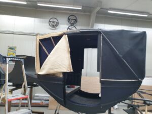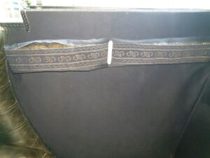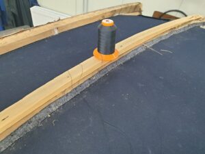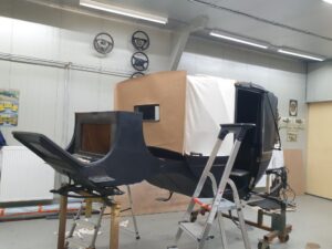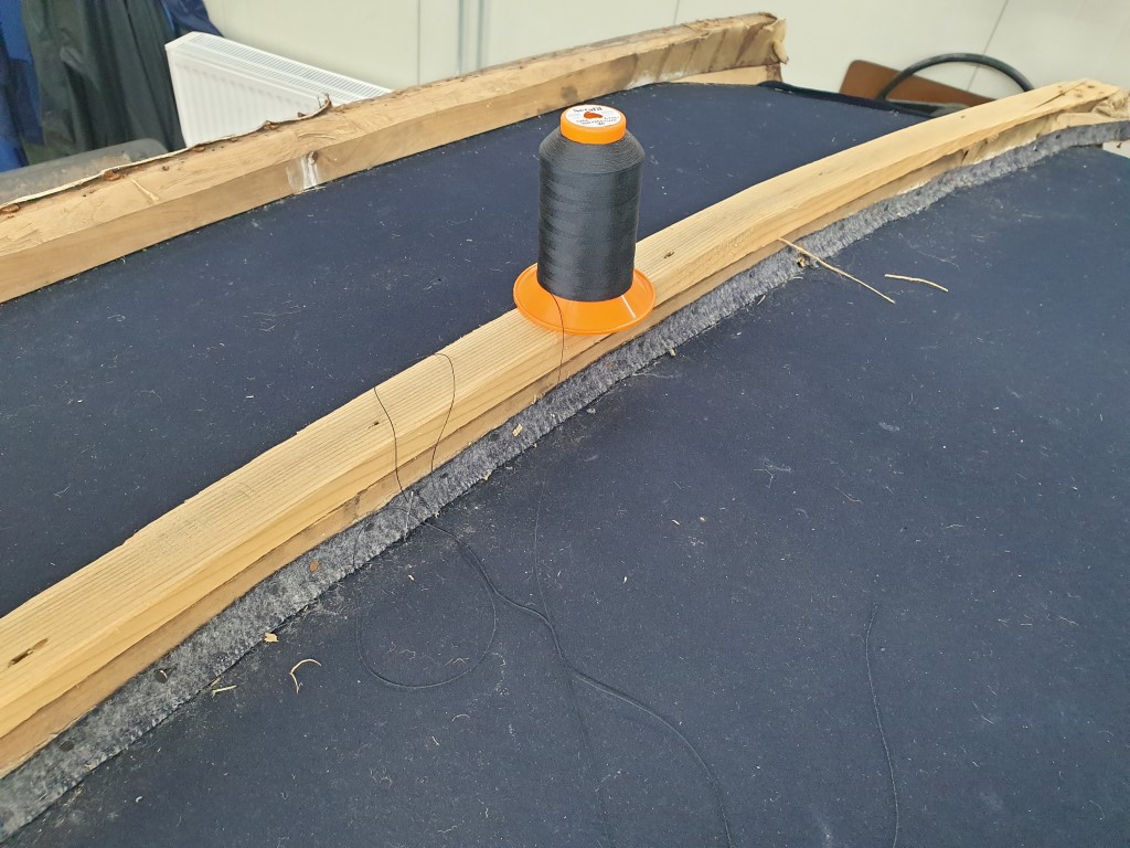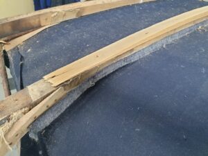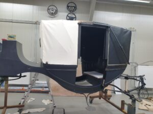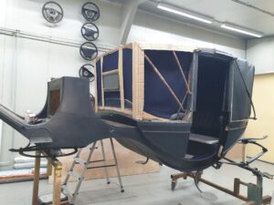 Ook de jute singels en katoenen ‘onderkappen’ zijn vernieuwd, en daarbij zat niet zoals gewoonlijk paardenhaar tussen het spantwerk. Dat is nu dus evenmin aangebracht. De hemels konden bewaard blijven, maar het garen waarmee deze is vastgenaaid is verteerd, vandaar dat dit garen is gedoubleerd. “Het project loopt volgens plan”, meldt de restauratieafdeling tevreden. Begin volgend jaar is het rijtuig, diep donkerblauw met zwart en witte bies geschilderd, in de heraldische kleuren Van Aldenburg Bentinck, landauer toonbaar op Kasteel Middachten in De Steeg.