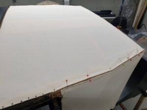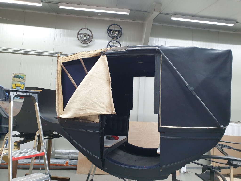 “Het oude kapleer was totaal verteerd, bij een poging de kap te openen scheurde hij overal nog verder af. Dus niet verder geprobeerd, en oude kap is er zo afgehaald dat we hem goed als voorbeeld konden gebruiken. Verder maken we mallen van papier om het model zo goed mogelijk uit te snijden. We hebben er één kap tegelijk afgehaald, zodat we de andere goed als voorbeeld hadden, immers we wilden een exact dezelfde hebben”, legt restaurator Maria Stolk van het restauratie-centrum in Balkbrug uit. Het is natuurlijk gelooid rundleer met longgrain print (stroprint).