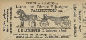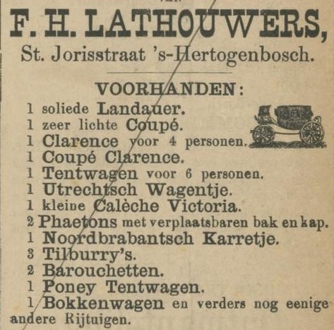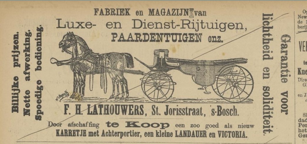 Eergevoel is er ook. “Naar wij vernemen, is door den heer F.H. Lathouwers alhier geweigerd de hem toegekende bekroning der tentoonstelling te Amsterdam aan te nemen op grond dat zijne inzending niet naar behooren beoordeeld is”, valt te lezen in twee provinciale kranten in september 1883 en het waarom laat zich raden voor wie de uitslagen van die tentoonstelling bekijkt: Lathouwers staat onderaan met een eervolle vermelding plaatsgenoot, terwijl concurrent C.A. Teulings een zilveren medaille wint. Den Bosch telt op dat moment drie serieuze rijtuigfabrieken die niet alleen elkaar beconcurreren.