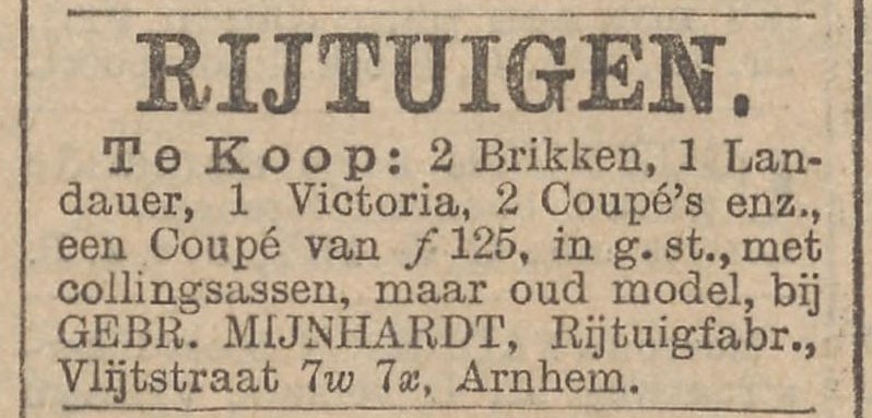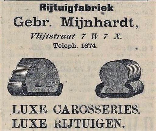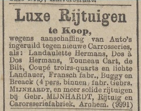 Als rijtuigfabrikant is de firma Gebr. Mijnhardt in Arnhem misschien te laat begonnen, in de carrosseriebouw maakten de broers Willem en Theo echter furore. Met dank aan hun start in de rijtuigen. De witte bruidscoupé en een parkwagen getuigen van het vakmanschap uit die beginperiode.