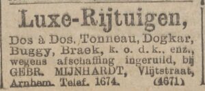Al de roem met auto’s te na, aan het einde van de Eerste Wereldoorlog is Mijnhardt blij nog iets in rijtuigen te doen. In 1917 gaat het filiaal in Voorburg dicht bij gebrek aan bestellingen, terwijl de zaak in Arnhem moet inkrimpen. In 1918 komen de inkomsten nog uit de verkoop van een gebruikte coupé ‘op zware gummi (kabelbanden), gebogen voorruit en blauw satijnen bekleding’ en andere tweedehandsjes als dog- en dresseerkarren, tonneaux, victoria’s en landauers. De prijzen liggen zo ongeveer op een kwart van de nieuwwaarde: ƒ 375,- voor een coupé ‘direct van den heerenstal’ met bruin laken, ƒ 275,- voor een vigilant.