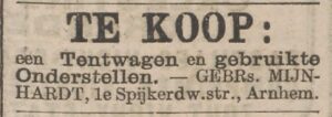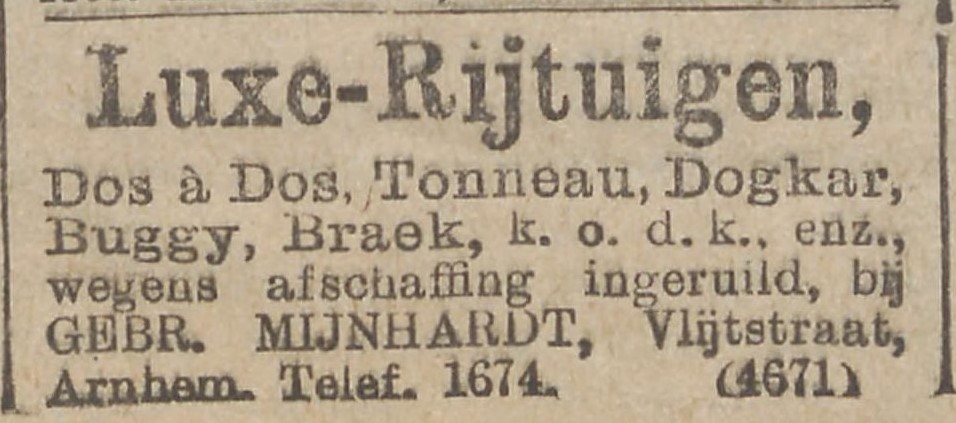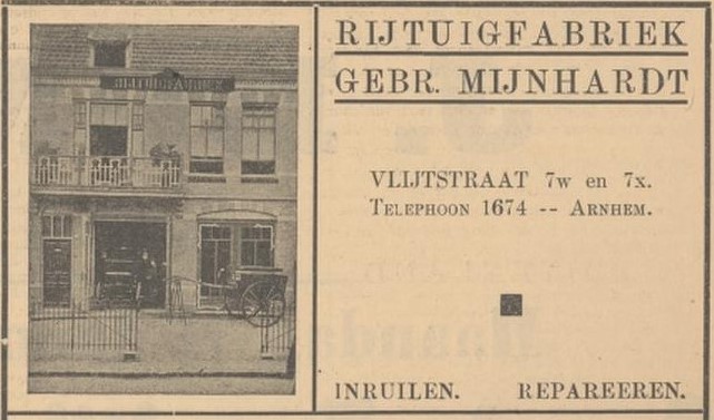 De broers Willem (1872-1960) en Theo Mijnhardt (1875-1954), zonen van een kuiper uit Dodewaard, starten in maart 1901 een wagenmakerij in de Eerste Spijkerdwarsstraat in Arnhem. Dat is dapper omdat ze er letterlijk onder de rook van rijtuigfabriek Veth zitten, een gerespecteerde firma die al bijna een eeuw de markt beheerst. Theo is de smid, Willem de zakenman van het stel. Van het maken van rijtuigen komt aanvankelijk nog niet veel terecht, het is eerder handel in een enkele tentwagen en onderstellen. Na drie jaar verhuizen de broers naar de Vlijtstraat 7 en gaan ze zichzelf rijtuigfabriek noemen. Mijnhardt biedt doorlopend een tiental rijtuigen aan, variërend van panier tot brik met winter- en zomerkap.
