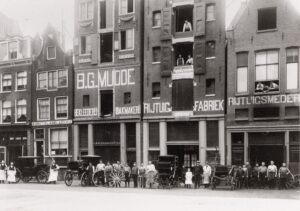 Wanneer de auto zijn entree maakt heeft Mudde de bedrijvigheid als carrosseriebouwer uitgebreid naar zes panden op een rij – de ruiten nog altijd kapot. In 1913 is zoon Theo H.G. Mudde (1891-1972), goed 22 jaar oud, zelfstandig aan het werk als carrosseriebouwer aan de Bloemgracht 102. Hij noemt zijn fabriek Excelsior, maar het loopt op niets uit. Wat er precies aan de hand is, laat zich slecht raden. Theo gaat hierna zijn eigen weg en leent in Den Haag geld om een metaalfabriek op te starten, die nog steeds bestaat onder de naam CM Staal in Wateringen. In 1915 is de firma Gerard Mudde verhuisd naar een geheel nieuw pand aan de Veerstraat 73-75 en floreert er met plaatwerk, stofferen en het afwerken van automobielen. Theo’s broer Gerardus Quirinus (1903-1993) begint ook als rijtuigmaker om de zaak van vader voort te zetten. In 1939 overlijdt de grondlegger van het bedrijf aan de Julianalaan 103 in Overveen, pas in 1983 sluit de BV carrosseriefabriek v/h Gerard Mudde zijn deuren aan de Veerstraat in Amsterdam.