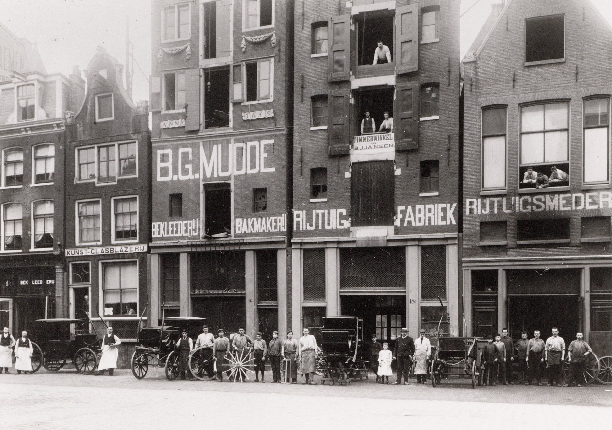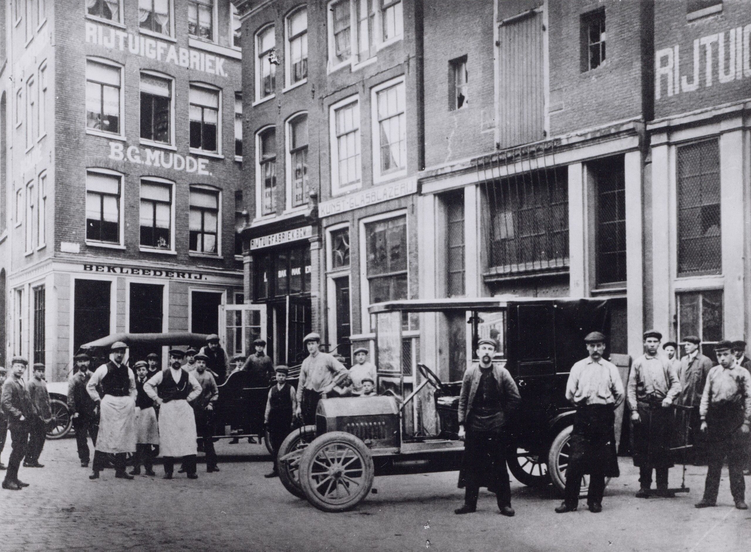 Of het is door de contacten die bijvoorbeeld zijn koffiehuis-houdende neef heeft of anderszins, de wagenmakerij van Mudde groeit uit zonder echt reclame te maken tot een heuse rijtuigfabriek. In 1897 volgt de toestemming om een smederij op te richten in de achtergedeelte van een pand, dat uitkomt op de NZ Voorburgwal. Een paar jaar later zijn foto’s gemaakt van het personeel voor de drie panden die Mudde in gebruik heeft aan de Spuistraat en die uitstralen wat de buurt erachter te verbergen heeft: armoede. De ruiten van de gebouwen zijn kapot, het oogt smerig en de reclame van een vorige huurder, timmerwinkel Jansen, is blijven zitten. Maar overduidelijk is de indeling van de fabriek: het pand rechts de smederij met zeven knechten, in het midden de timmerwerkplaats met acht knechten en in het rechterpand de werkplaats van drie stoffeerders. Het lakwerk, waarvoor een stofvrije omgeving is vereist, is kennelijk uitbesteed aan een zelfstandige schilder elders in de stad. Rechts van het midden staan de directeur Gerard Mudde met een van z’n dochters, zoontje Theo en met wit schort, de meesterknecht. Uit de ramen op de bovenetages hangen ook nog zeker zes knechten om op de foto te komen. De mannen poseren met drie coupés waar ze aan werken en een zogeheten coureuse, zoals in Nederland een kleine phaeton werd genoemd.