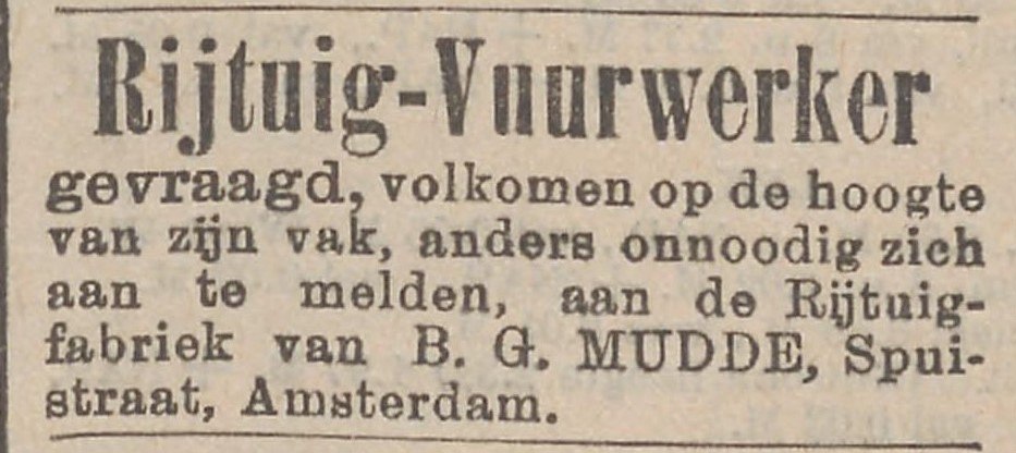 “Jij ben een lelijke, vuile kerel; je bent een plaag”, brulde Gerard Mudde tegen een politieagent die hem bekeurde vanwege een rijtuig dat illegaal op de stoep stond. Voor die belediging veroordeelde de rechter hem tot 25 gulden boete. Maar aan de rand van een Amsterdamse sloppenwijk weet Mudde een rijtuigfabriek met zo’n dertig knechten op te bouwen. Coupéetjes en vigilantes voor stalhouders bouwen ze, zelfs het eerste Nederlandse rijtuig op luchtbanden. Wie naar boven kijkt in de Spuistraat kan er het vage, witte ‘rijtuigfabriek’ nog op de gevel zien staan.