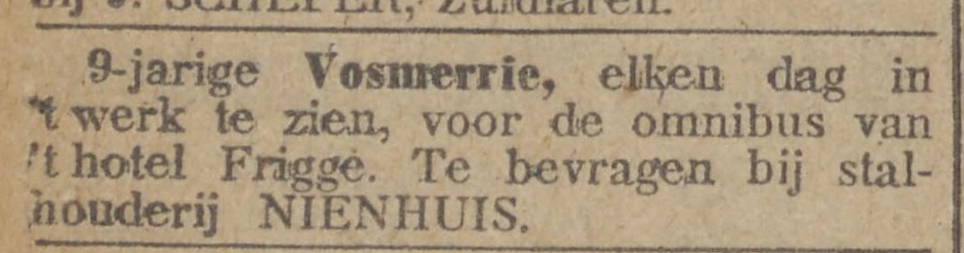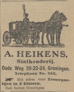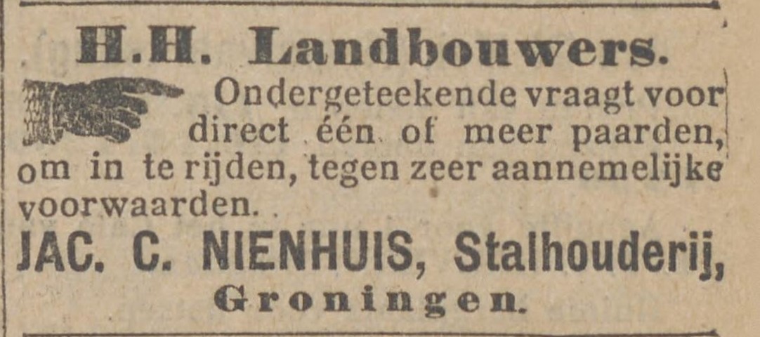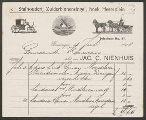 “Grootvader had wel honderd rijtuigen. Ze deden soms wel vijfhonderd ritten op een avond. Hij liet zijn rijtuigen allemaal maken in Brussel. Elk jaar bestelde hij voor zo’n tienduizend gulden aan rijtuigen”, pocht Hillie Hemmes-Nienhuis in het Nieuwsblad van het Noorden van 31 maart 1977 over de vestigingen van Casper Nienhuis aan Marktstraat, Spilsluizen en Zuiderbinnensingel in Groningen. Het geheugen van de 72-jarige dame is misschien wat te kleurrijk, maar feit is dat haar grootvader een grote is in zijn tijd. Hij begint als zoon van een paardenhandelaar-voerman en werkt zich op tot ‘de herenboer’ van de stad.