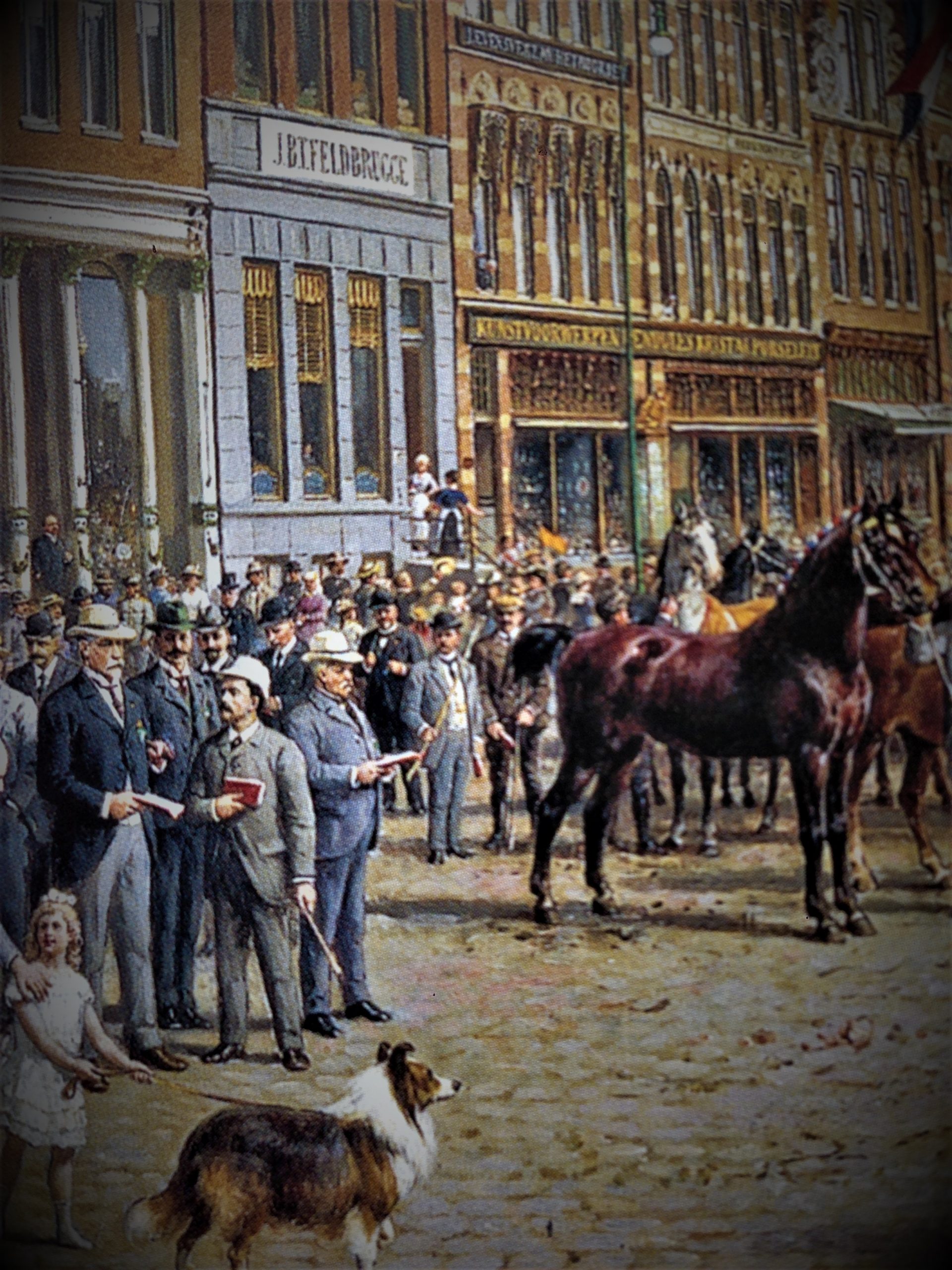 “Het span schimmels bracht ƒ 2.001,- op; die ene gulden kwam van het mijnen, wat in het noorden niet gebruikelijk is. Had de makelaar de combinatie verder bij opbod verkocht, dan was dat voor de aanwezigen duidelijker geweest. De beide zwarte paarden brachten ƒ 770,- op. Zo hield de een uitverkoop en deed een ander inkopen en het resultaat is dat alles hetzelfde is gebleven, want ook morgen, volgende week en volgend jaar zult ge de fleurige trouwstoeten naar het stadhuis zien rijden en de droeve rouwstoet met de zwarte koetsen en de zwarte paarden naar de noordelijke of de zuidelijke kant van de stad zien gaan…”