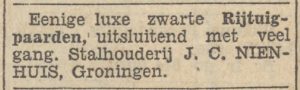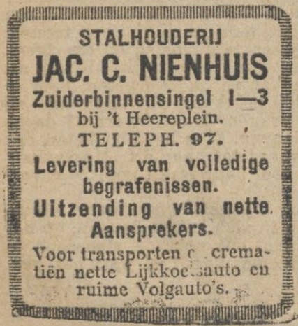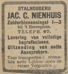 In de jaren twintig is het meest lucratieve het begrafeniswezen, waar in een grote stad als Groningen altijd werk in te doen is. Zwarte ‘bovenlandse’ paarden heeft Nienhuis daarvoor nodig. Met minder trouwritten komen enige rijtuigen, waaronder twee coupés, te koop.